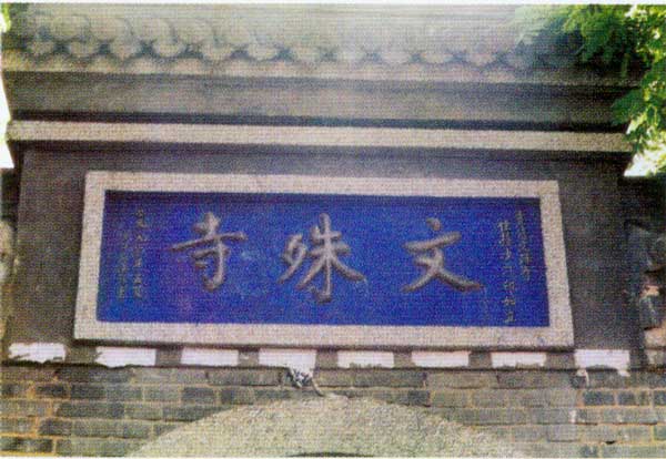 从天王殿东面门亭进入寺内,对面有一照壁,中间书有一个大大的“佛”字,两旁书有:“若人散乱心,人于塔庙中。一声阿弥陀,皆共成佛道。”背后书有“法 轮常转”。该院正面建有文殊殿3间,硬山顶,前面东西两角出檐向上翘起,屋脊正中有一高大的黄色琉璃覆钵式塔。殿门上方有“登欢喜地”一块大匾,殿内正中 塑有骑狮文殊菩萨,文殊像左前方塑有韦驮菩萨,右前方为吕菩萨。文殊右面为骑象普贤菩萨,左面为骑朝天吼观音菩萨。背后塑有“西方三圣”站像,中为阿弥陀 佛,左为一手拿柳条、一手拿净瓶的观音菩萨,右为大势至菩萨。殿内东南面挂一铜钟。