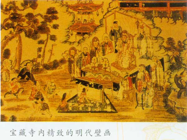 宝藏寺位于繁峙县城东30千米处的东山乡中庄寨村。寺宇坐北面南,占地面积2400平方米,分东西两院。东院现存正殿3间,东西配殿各5间。正 殿面宽3间,进深2间,悬山顶,为明代建筑。殿内正中塑送子观音像,东面墙壁上绘有12幅观音普门品图,另画寺庙一座。西面墙壁绘有十八罗汉图、五百圣僧 过江图、十殿阎王图及地狱受苦图。北墙上绘有文殊、观音、普贤三大士像及6尊胁侍菩萨图。这些壁画为明代所作,共60平方米。其内容丰富,设计新颖,布局 合理,形象生动,笔法细腻,为明代壁画中的珍品。
