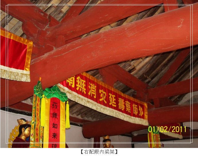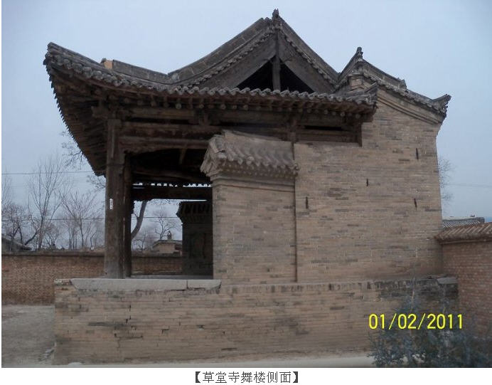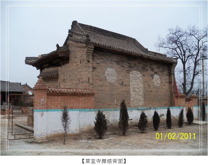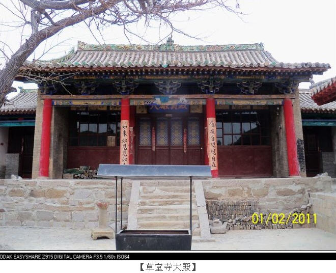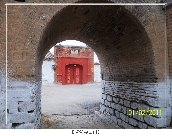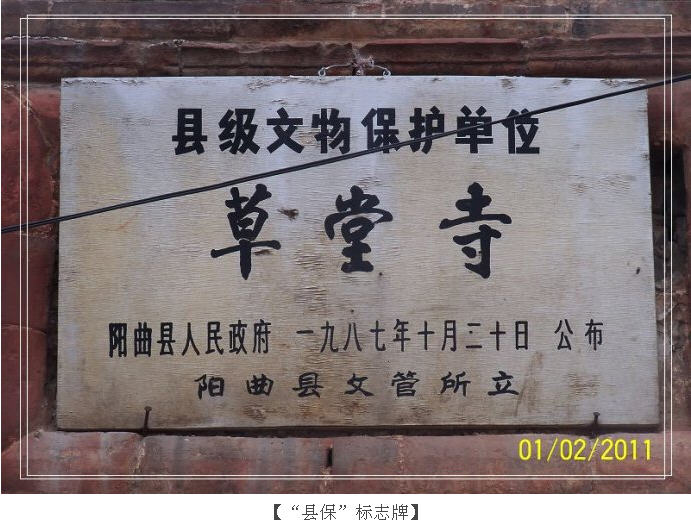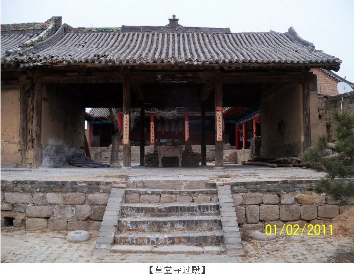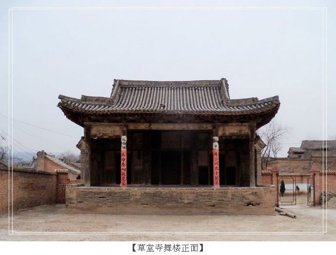 阳曲县草堂寺 阳曲县重点文物保护单位。位于阳曲县侯村乡洛阳村。始建年代不详。据寺内碑载,元至正元年(1341年)、八年(1348年)重建,明正德七年(1512 年)、十二年(1517年)扩建,嘉靖十二年(1533年)建戏台。清代屡有修葺。寺院占地面积3740平方米。坐北朝南,二进院落布局,中轴线上建有戏 台、过殿、正殿,两侧为娘娘殿、东西配殿。正殿面宽三间,进深六椽,单檐悬山筒瓦顶,七檩前后廊式构架,斗三踩单昂,柱子侧角明显。前檐明间设四扇六抹 扇门,覆盆式柱础。殿内新塑彩像5尊。寺内存北朝造像碑1通,明碑一通,娘娘殿存明代绘制圣母出巡图壁画15.2平方米。