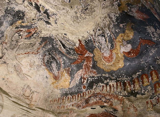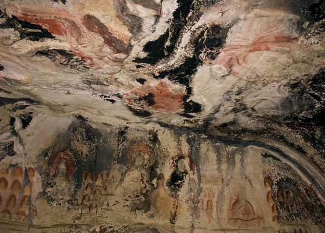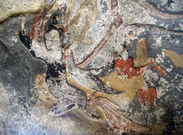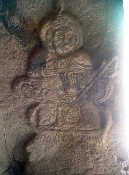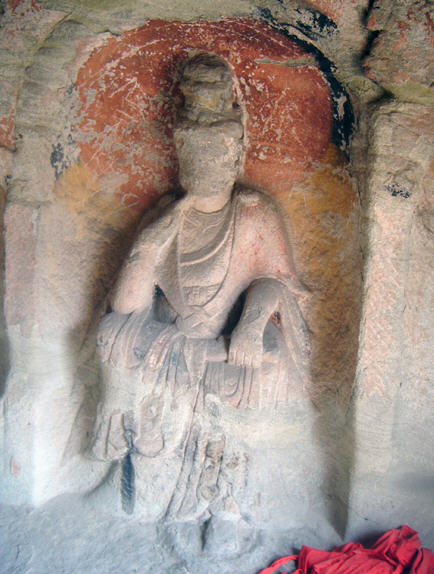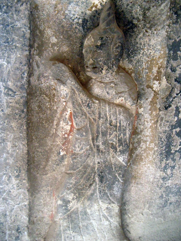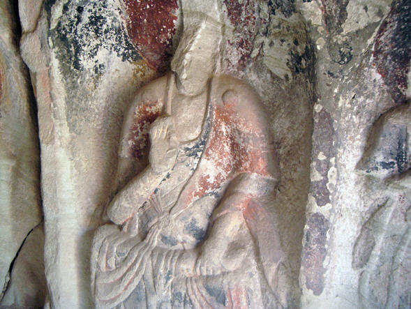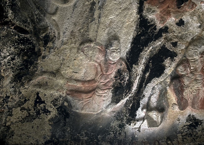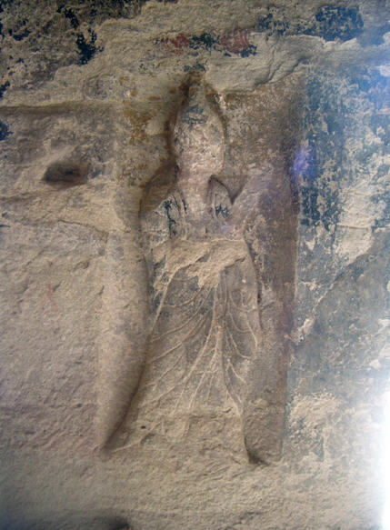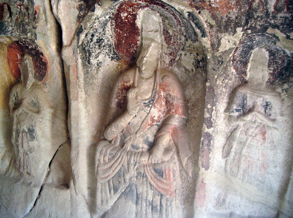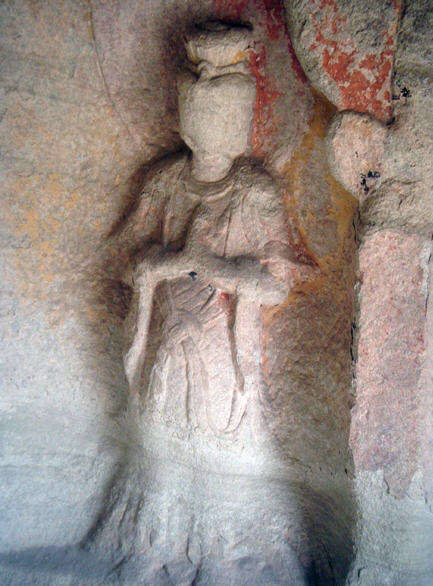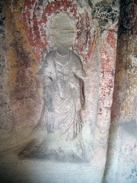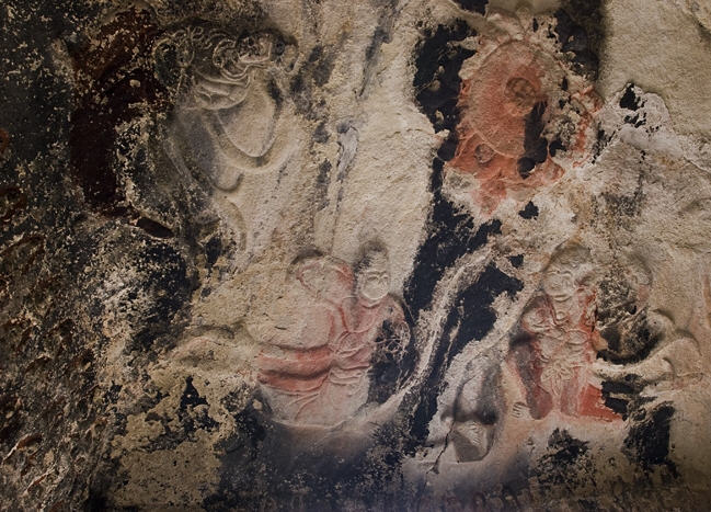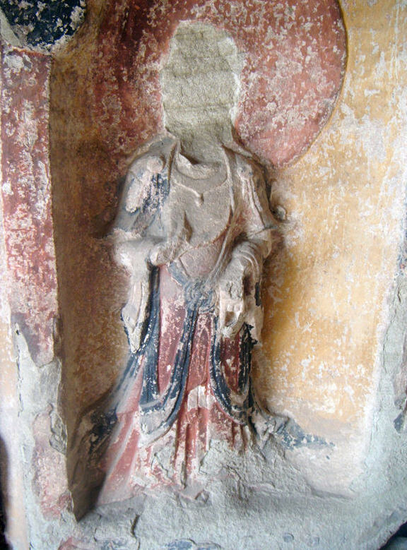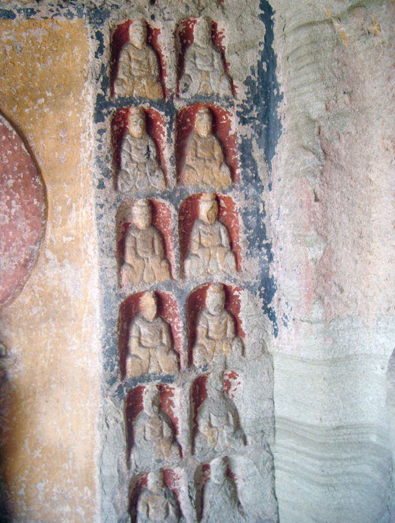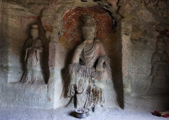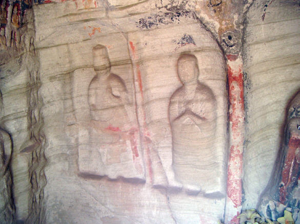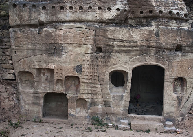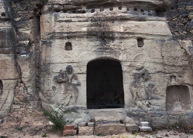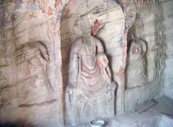 南窟距北窟约3米,平面略呈梯形,人字披顶,前壁宽2.7、后壁宽3.5、进深2.7、高2.8米。窟门两侧各浮雕一天王像。窟内造像题材与南窟相似。