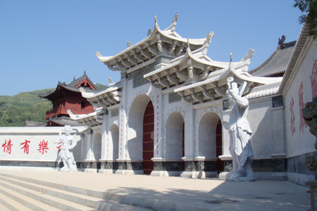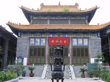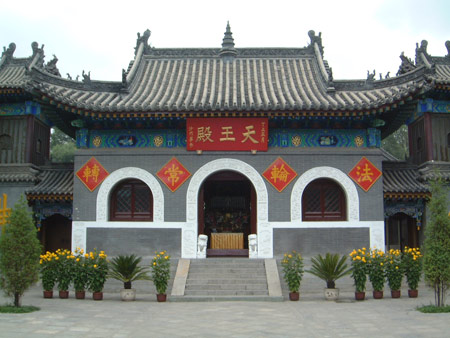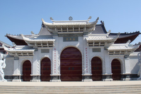进入寺门,迎面是天王殿,弥勒佛坐拥其地,笑口常开。过天王殿眼前豁然开朗,别有洞天。远处的大雄宝殿居高临下,翼 然飞来。移步拾级而上,雕栏玉砌,均由玉沙岩造就。大雄宝殿高近30米,建筑面积2300平方米,可容千僧早晚诵经。宝殿正中分别供奉着释迦牟尼佛、药师 佛、阿弥陀佛三圣像;圣佛端坐于莲花宝座上,慈眉善目,祥和安泰,僧尼大众顶礼膜拜,无不心生敬仰。