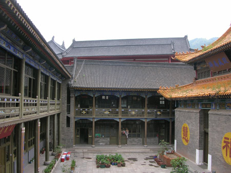 第三院是普光明殿院,供奉着镀金的华严三圣像,中间为圆满报身毗卢遮那佛,右面为大智文殊师利菩萨,左面为大行普贤菩萨。此院又名“学生院”,顾名思义,此处学生最为集中。东西楼有僧舍20余间,住众近200人。