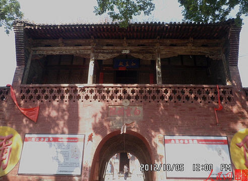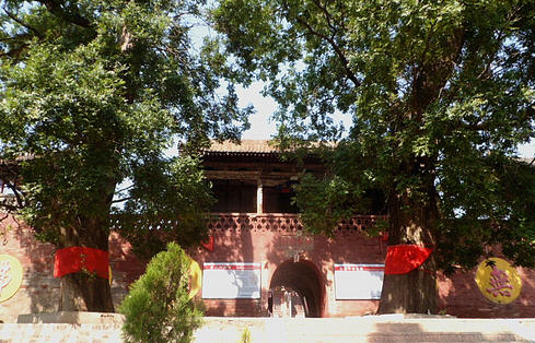山门外有四株参天古柏,象征着佛门的四大金刚。山门为三开间拱门洞式,洞顶上于嘉庆元年(1796)七月十五日增建“春秋楼”三间,内供关羽金妆像,因关 羽一生精读儒教“五经”之一《春秋》,并有很深的造诣,故名。山门两旁原有钟鼓楼各一座,“文化大革命”中被毁。