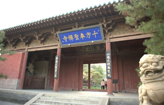 太 原奉圣寺 位于晋祠最南区,全称“十方奉圣禅寺”,又名“释迦厂”。原系唐开国功臣鄂国公尉迟敬德的别墅,唐武德五年(622年)兴建为寺。该寺历代均有修葺,规模 宏大。现存建筑为1985年迁建。中轴线上依次为山门、过殿、大雄宝殿。寺前望佛桥横跨晋水,桥头有巨槐一株,干老枝嫩,人称“复生槐”。寺门系原晋祠大 门景清门,面阔五楹、进深二间,四架椽屋分心用三柱,五铺作重出双抄,单檐歇山顶。前院南小亭内斜卧古松一棵,树身长4.8米,状若蟠龙,传为尉迟敬德 挂甲处,被称为“挂甲松”。左右两廊有唐刻、唐译80卷《华严经》石经96幢。过殿三楹,为元代所建,1981年由山西汾阳县三泉镇平陆村迁来,原称二郎 庙。殿前松、柏各一株,传为尉迟敬德手植。大雄宝殿面阔五间,进深四间,原系马庄明代芳林寺大殿,1980年迁来。殿内陈列有北齐娄睿墓壁画。