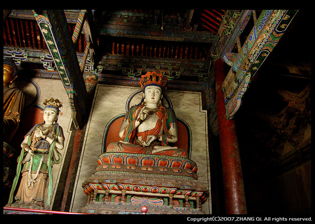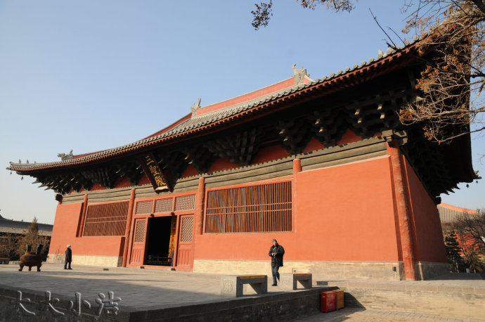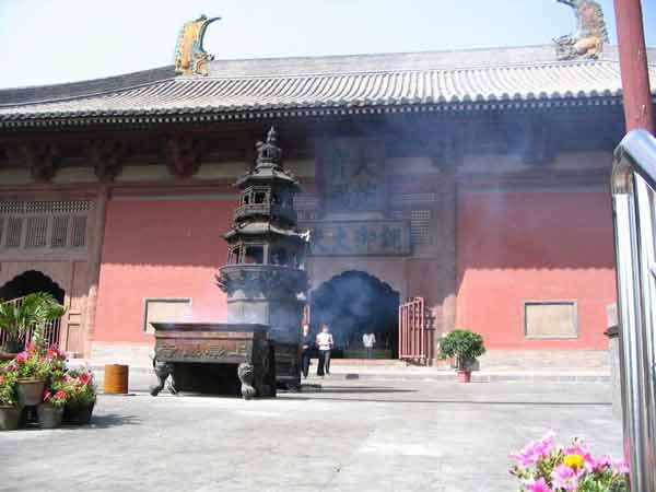 始建于辽代,金天会、皇统年间重修,殿的台基高3米,殿前月台东西长31米,南北宽21米,明万历年间增建牌坊三间,钟鼓亭各一座。大殿面阔七间,进深五 间,明间与左右稍间设门,四壁无窗。单檐五脊顶,屋顶坡度平缓,没有推山,充分体现了辽代建筑的特征。殿内正中有平藻井两间,剩下的都是彻上露明造,斗八 藻井内围列斗拱两层,雕制精湛,其形制、手法属于典型的辽代形制。大殿正中佛坛上塑有五方佛,端坐在莲台上,佛身高4.05米,泥塑,金身,衣纹流畅,姿 容凝重,气宇轩昂。东西两侧的二十四天王像,高3米多,体态丰伟,神情有不同。西、南两壁上绘满了佛教故事壁画,线条流畅圆润,人物栩栩如生,虽然是清朝 康熙二十五年至四十七年所绘,但还保存着元代的遗风。