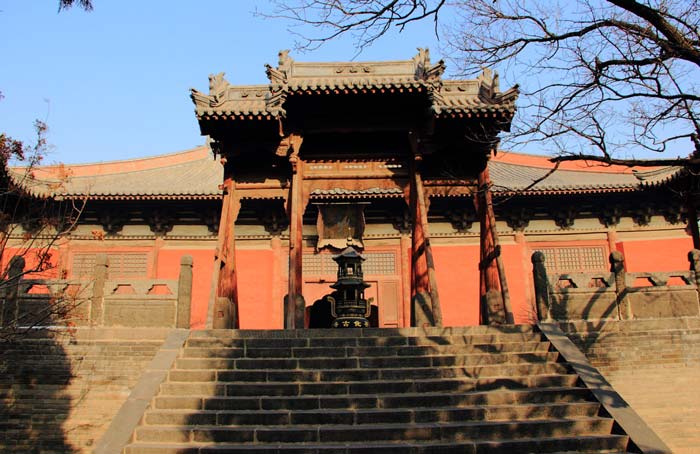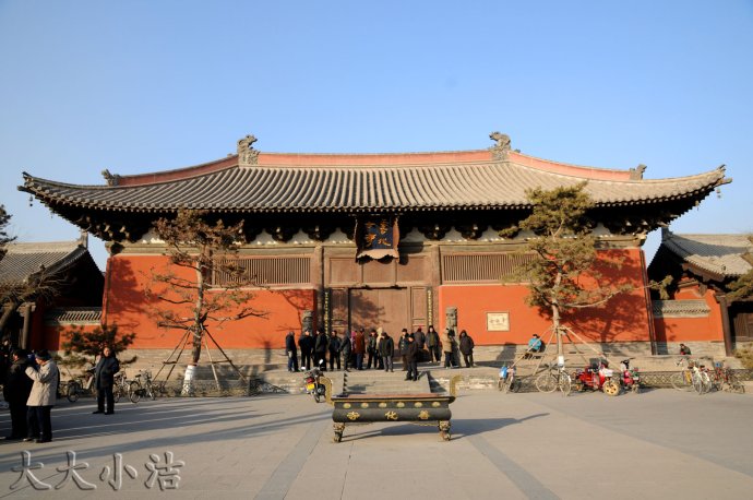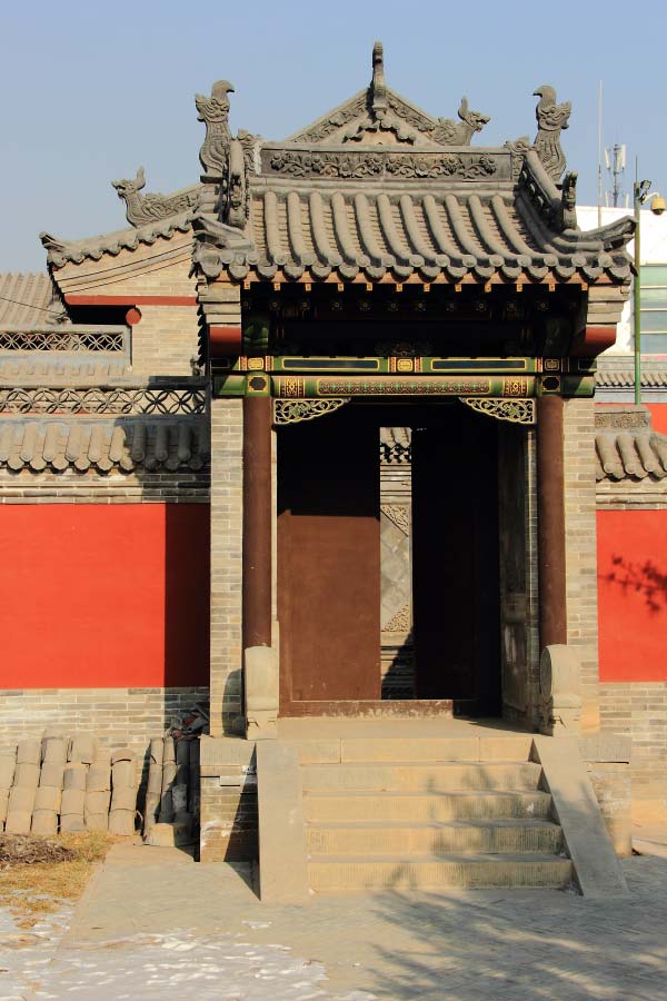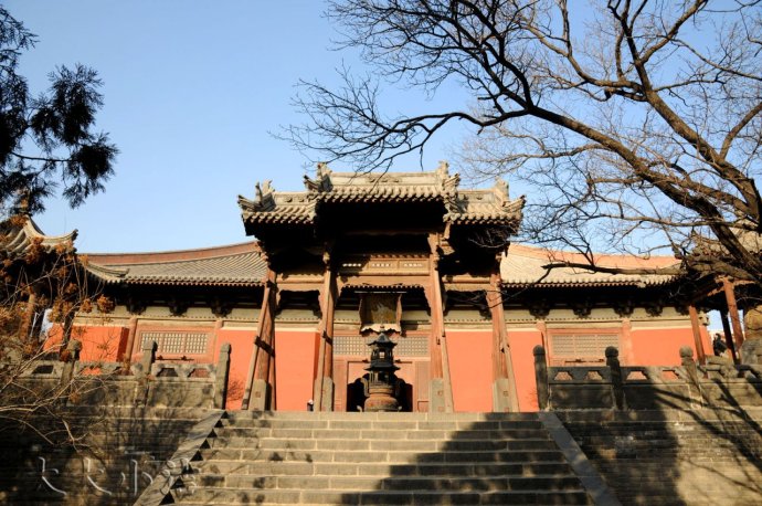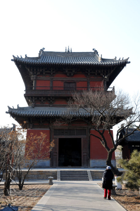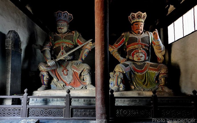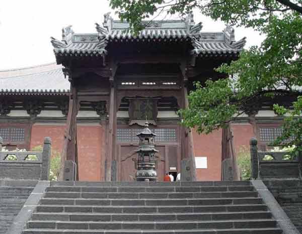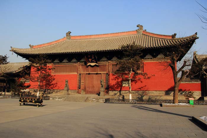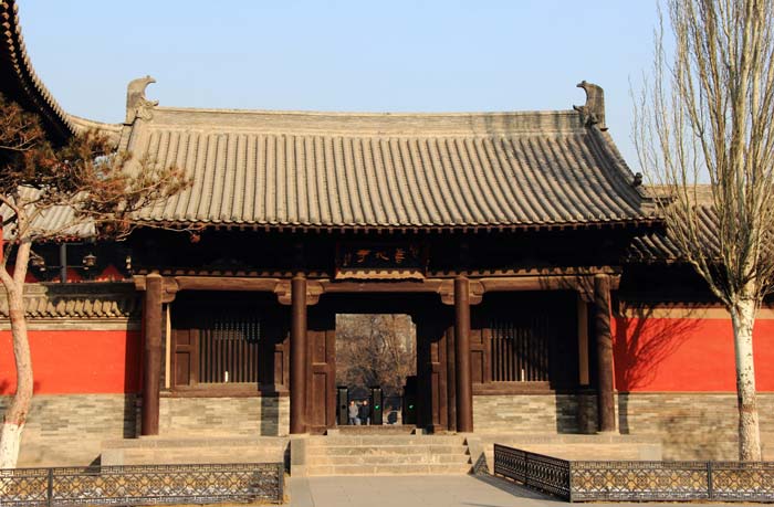 又称天王殿,面阔五间,进深两间,单檐庑殿顶,门前有月台、踏步,一对石狮雄踞其上,殿的左右次间有明塑的四大天王像,横眉怒目,姿态威严。山 门殿柱分布整齐,前后檐柱各6根,纵向立柱6根,内外柱同高,是此殿的独特之处。山门的梁栿都是月梁式,砍削规整,形制美观,是中国现存最大的金代山门。