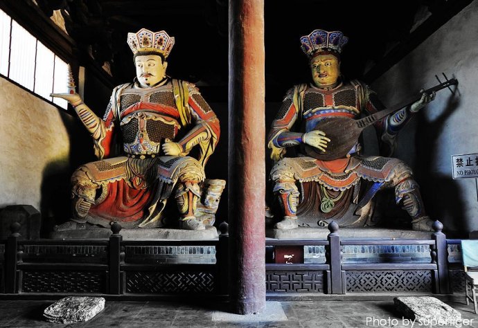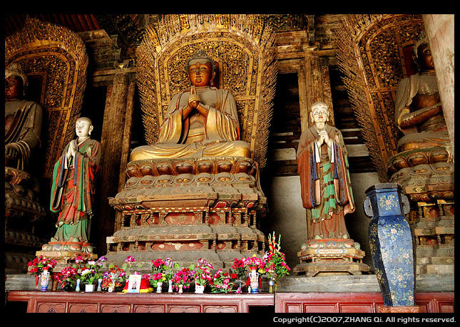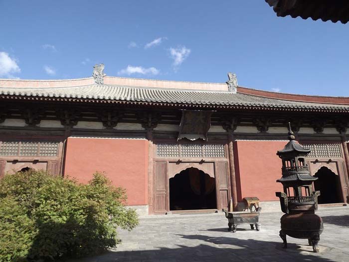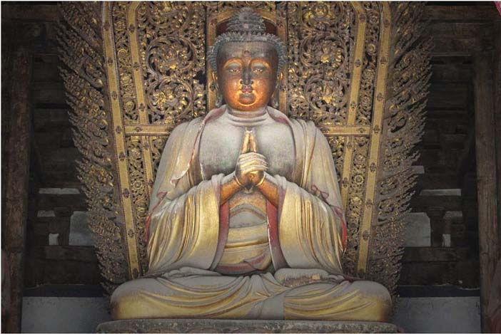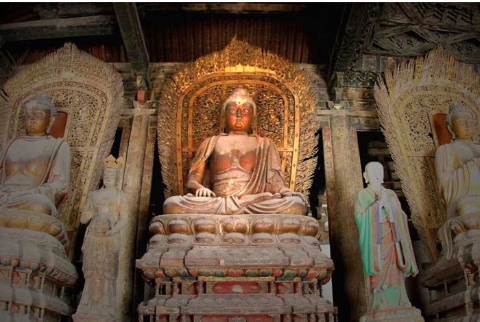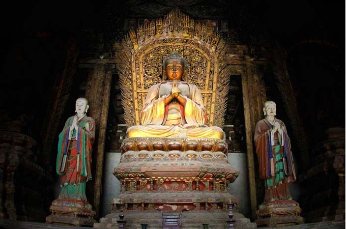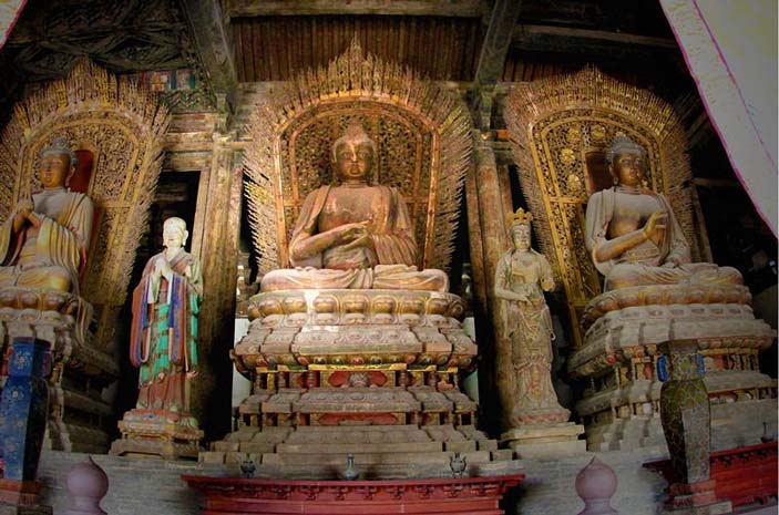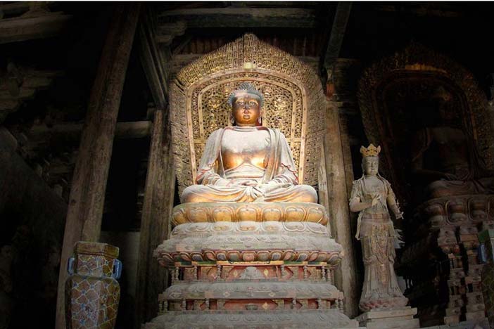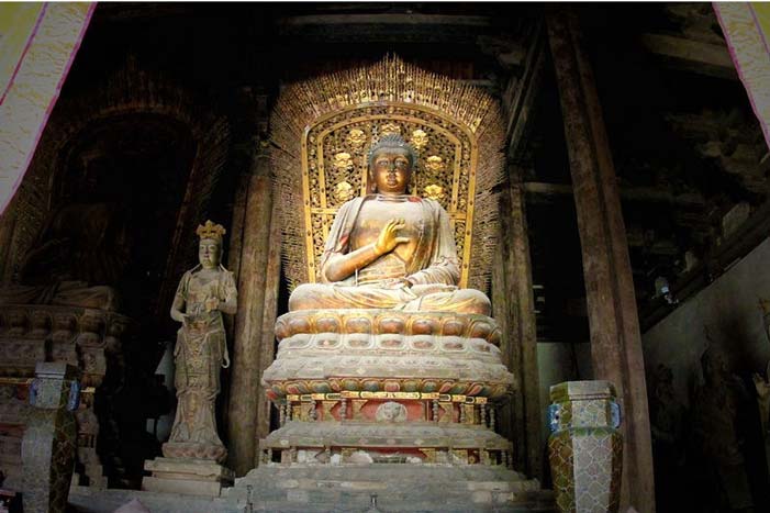 是全国现存辽、金时期寺院中布局最完整的一座。大雄宝殿为辽代的建筑,金代重修。殿内佛坛正中有泥塑金身如来5尊,端座于莲台,弟子、菩萨恭敬谦谨。两 侧是24诸天,西、南两碧绘有佛传故事画。三圣殿建于金天会六年(公元1128年),内塑立像3尊,中为释迦牟尼佛,右为普贤菩萨,左为文殊菩萨,称“华 严三圣”,取名三圣殿。普贤阁结构精巧,形制古朴,是辽金时代楼阁式建筑。阁南有琉璃烧制的五龙碧一座,色彩绚丽,富丽堂皇。