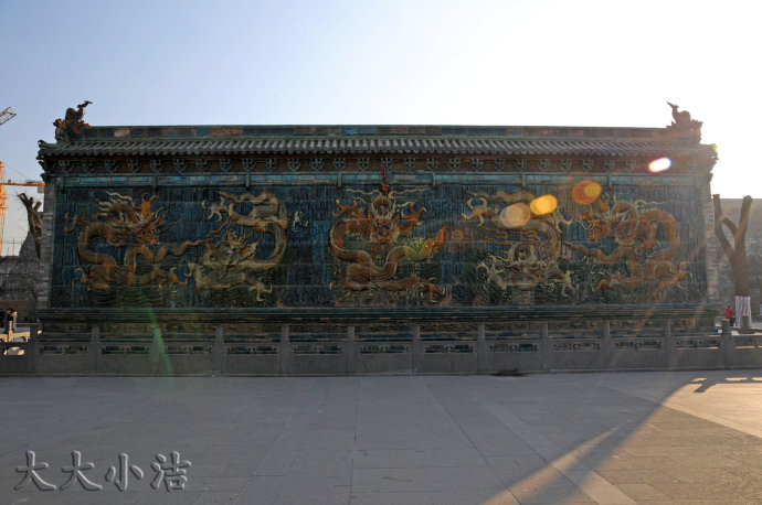位于天王殿西侧,普贤阁南面,原为兴国寺山门前的照壁,建于明朝万历年间,1980年拆迁至善化寺内。五龙壁高7米,厚1.48米,共分上、 中、下三个部分:下部为须弥座,座面雕有牛、马、蛇、兔、鹿、狗。狮、象、膜鳞、狡倪等十多种动物,姿态各异,栩栩如生;中部宽大壁面之上雕有五条四爪金 龙,腾云驾雾,大有龙飞虎跃之势。正中一条金龙,为五龙壁之核心,龙头向前,龙尾摇摆,鳞光闪亮,别具风采。两侧各有二龙互相对称,中龙色泽稍淡,仿佛由 天降下,正在兴云播雨。南北两侧游龙、龙身略呈卷曲,昂首挺胸,伺机腾飞上空;顶部为仿木构建筑形式,上有琉璃瓦覆盖,下有琉璃斗拱支撑,两端置有鸦吻垂 脊兽。五龙壁旁侧有一尊铁牛,保存完好,四肢健壮,原在御河西岩,为镇压河妖,消除水患而铸造伫立,后移于此处。