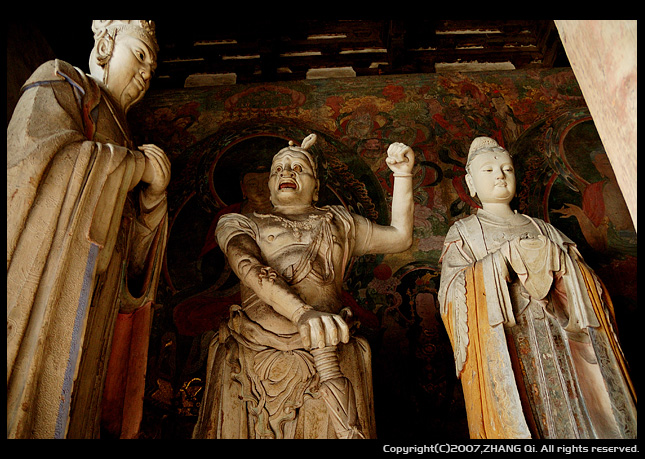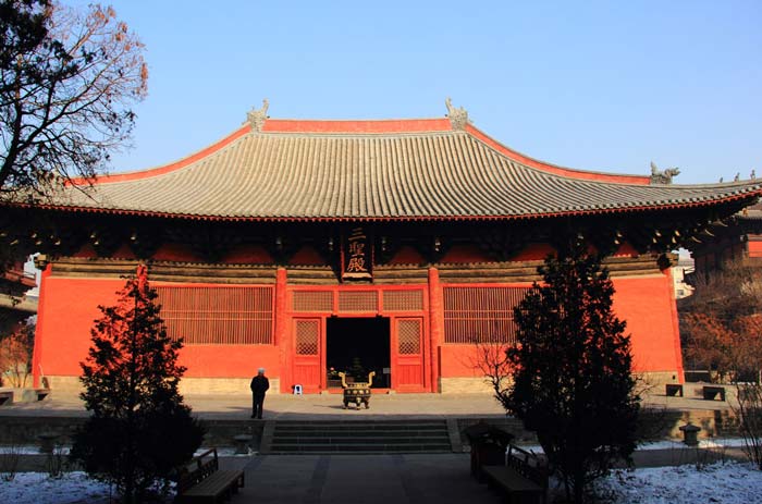 俗称“过殿”,建于金天会、皇统年间,因殿内置毗卢遮那佛(中)、文殊(左)、普贤菩萨(右),名华严三圣,而得名。三圣殿高17.5米,宽 34米,殿面阔五间,进深四间,单檐庑殿顶,檐下斜拱宏大华丽,是金代斗拱的典型作法;殿的内部平面采用减柱法,显得空间十分开阔;左右次间各出60度斜 拱,形如花朵怒放,佛坛上的华严三圣是金代的原塑。殿内两侧尚保存有四块石碑,其中西侧金大定十六年(1176年)《大金西京大普恩寺重修大殿记》是南宋 使金通问副使朱弁撰,朱氏幽居该寺任教14年,目睹了寺院重新修建的经过,故而碑文不仅文采飞扬、字迹逎劲,而且记载翔实可信,是研究善化寺的重要文献资 料。