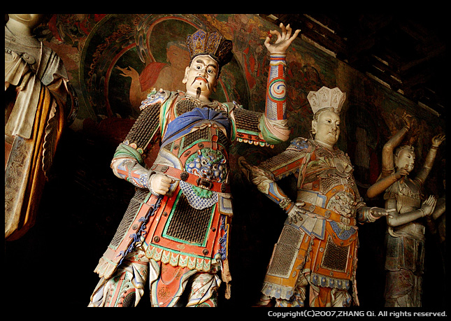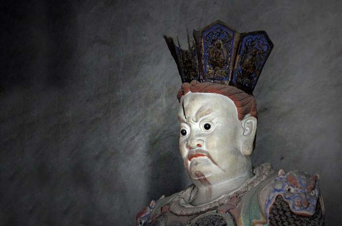 大雄宝殿殿内两侧,按佛法传统塑有二十四天王像,但是佛像总数却有二十五尊,这是因为其中的鬼子母像是由两尊塑像组成。鬼子母神,高3.66 米,姿态幽雅,表情含蓄,俨然是贤淑贤惠的妇女形象,其左下方,有一尊小塑像,高为1米,但却青面红发,狰狞恐怖,形象丑恶。传说,鬼子母曾经是一个美丽 少妇,怀孕时前去拜佛求神,途中被强盗杀害,因此心怀愤恨,变做饿鬼,报复人间,最终在佛祖的感召下,鬼子母幡然醒悟,皈依佛门,成为护法神。