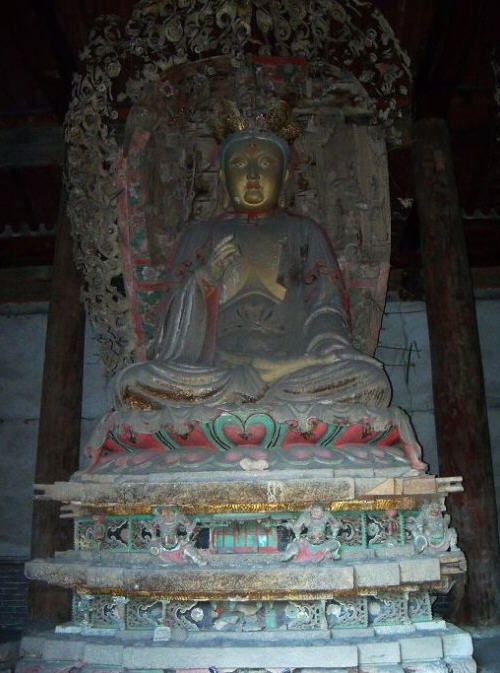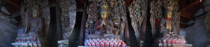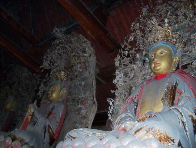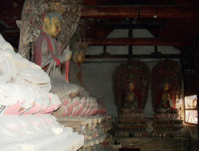 七佛殿年久失修,早在20世纪80年代初,《文物保护法》刚刚颁布,大殿已岌岌可危,殿顶多处见天,后壁将倾,西半部之后壁已前倾,把阿弥陀佛连同背光 饰一同挤向前,大约如果不是“佛力无垠”的话,早就坍塌了,这当然是笑话。当时经十名省人大代表呼吁,县政府从困难的财政中挤出了一点儿资金,采取了些简 单的应急处置措施。直到20世纪90年代初,平遥县赵克孝先生等几位老干部倡议成立了“平遥县老干部文物之友协会”,联名向全国各地的平遥籍干部发出倡议 信,募捐资金,并由县政府拨一部分款,才得以彻底整修,殿中珍贵文物“三佛四菩萨”才得以拯救无恙。正殿佛台上供有高大的“横三世佛”,即东方净琉璃世界 药师佛,西方极乐世界阿弥陀佛,中间是婆娑世界释迦牟尼佛,殿东西壁前佛台上供有文殊、普贤、观世音、大势至四位菩萨。七尊佛像都高大端主动,结迦趺坐于 须弥座莲花台上,雕塑艺术水平非常高超,就连须弥座上八尊小力士像也塑得神气活现,背光上的玲珑装饰,佛座上的细小图案饰物等,无一不是精雕细琢。四尊胁 侍站像一尊已毁,其馀三尊也很精致,令人叫绝。