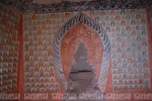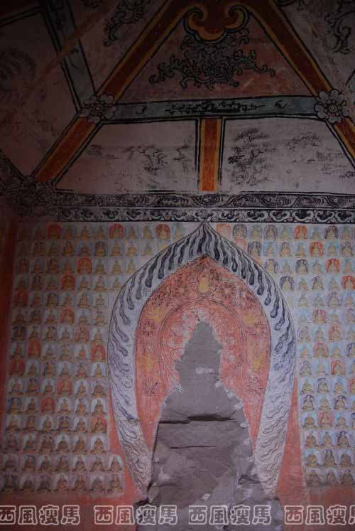 后洞位于其东北5米处,大小与前洞相似,洞内有8幅生动幽美的山水、飞鸟图案。