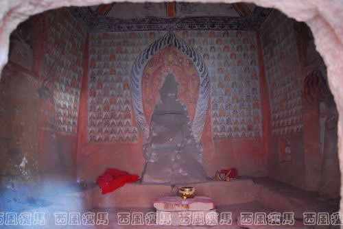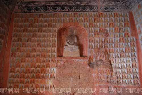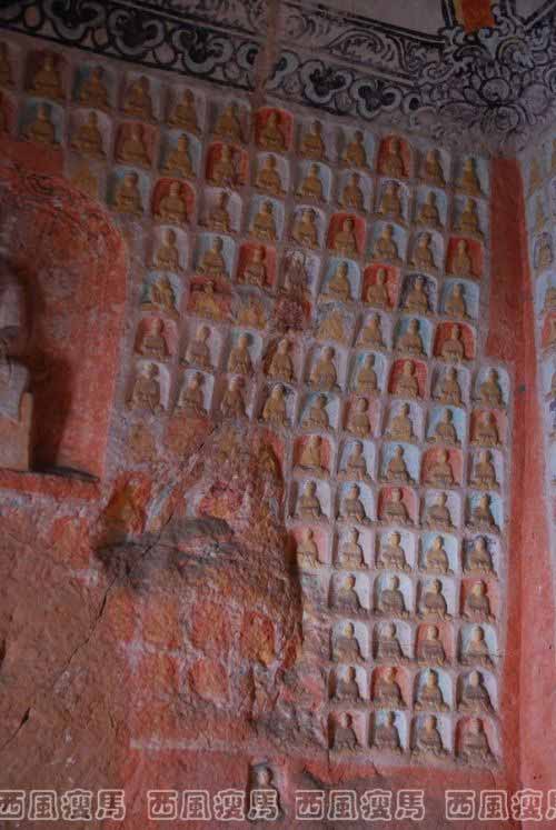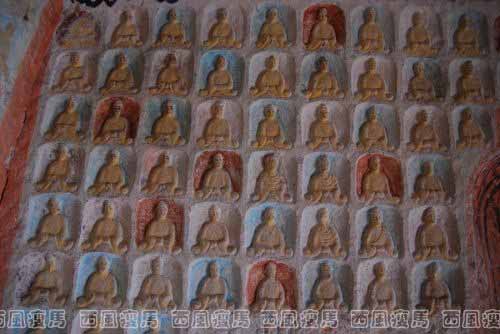 寺东北隅,千佛洞,又名“石室方丈”,其状如瓮,初入甚小,愈进愈大,石声峥峥,故名“石室寺”、“响堂寺”。前 洞,形近方形,面积为15平方米。洞内石壁环列,石佛1090尊。其高者 1米许,低者8、9厘米。其体态,宽衣博带,丰满大方,高高的鼻梁,深邃的眼神 ,粗看似千人一面 ,细观则各有千秋。洞顶成轿篷状,绘有4幅山水画,图案鲜明,艳丽生动。