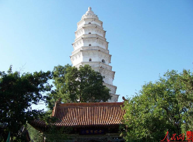 寺院座北向南,平面呈长方形,面积3500平方米。寺宇前后三进院落,规模完整,布局严谨而又显疏朗。无边寺也因寺院中央的这座白塔而更为壮观,白塔塔 身白色,外观楼阁式,气势壮观,瑰丽精致,米,共有7层塔,平面八角形,七层,高43.6米,每层有出檐及平座,檐座之下皆有斗拱,各层拱券门洞与檐外相 通,并雕有假门窗。塔内底层为小形方室,有磴道可上,二层以上中空,安有楼板及木梯,供人登临。最上一层的出檐与平台间筑莲瓣三层,塔顶为宝瓶式塔刹。此 制是唐塔中空到宋塔实心的一种过渡形式。56个出檐挑角装饰彩釉龙头,顶悬铁铃,风吹叮当有声,数十里外可见。游客立于塔顶平台鸟瞰全县,十里风光尽收眼 底。