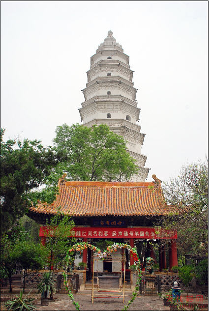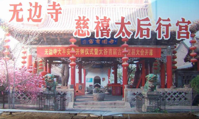 现存白塔为北宋元佑五年(1090)续修无边寺时所建,实为由唐塔中空到宋塔实心过渡形式的实物例证。寺的东西两侧,还建有碑廊、厢房、 藏经楼、配殿、禅院等。现今,殿宇内辟为陈列室,陈列赵昌燮的书法艺术及古木器、刺绣等工艺品,殿宇间花草繁茂,彩绘一新,是太谷县城的主要旅游胜地。