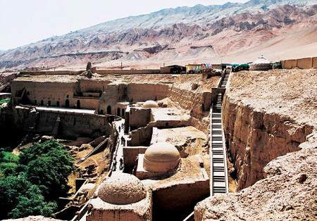 二、公交车:从吐鲁番客运站乘吐鲁番至鄯善或三堡乡的班车,在胜金口下车,换乘当地客运三轮摩托或搭乘去千佛洞的便车即可(吐鲁番一胜金口5元/人,胜金口一千佛洞6元/车)。
