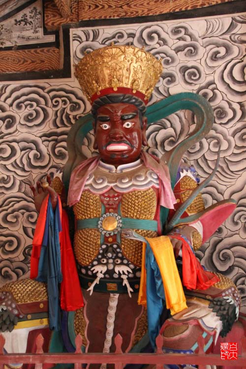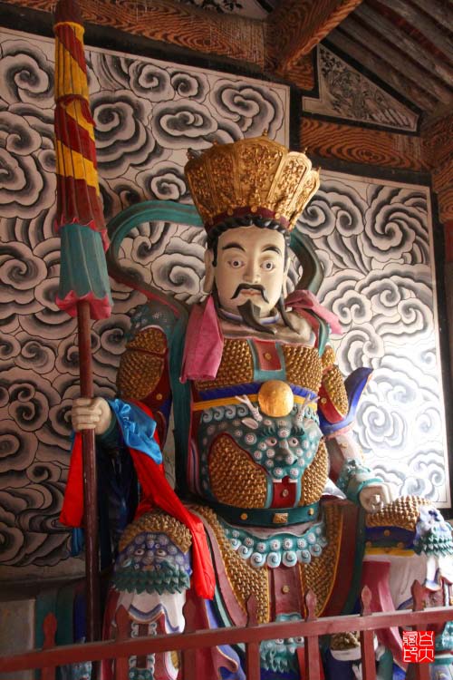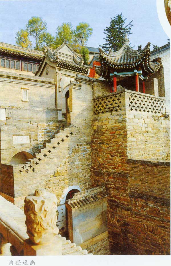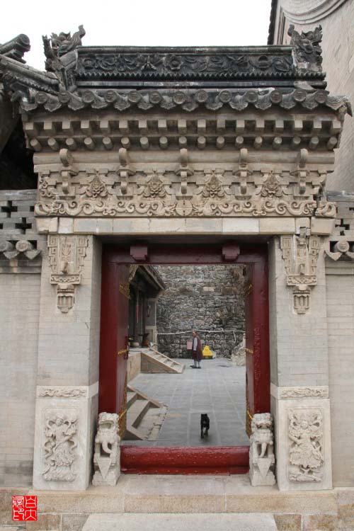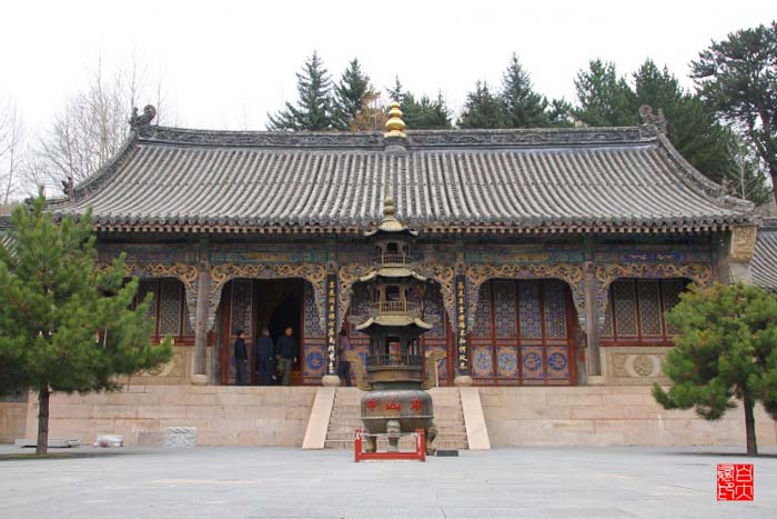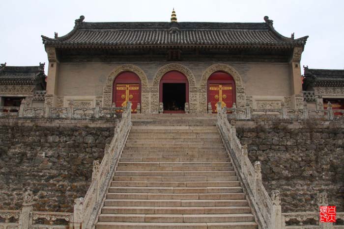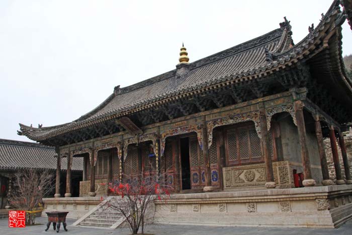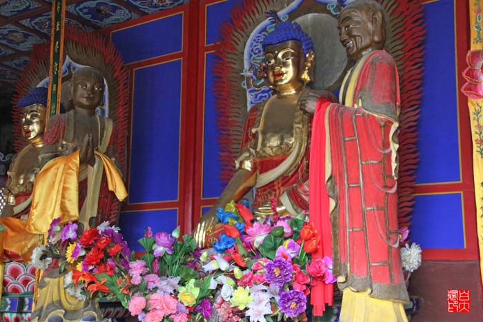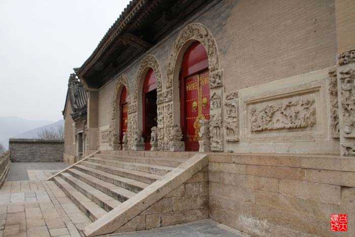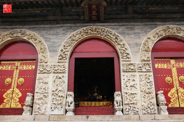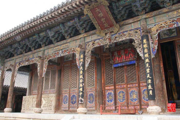 第二层殿是大雄宝殿,里边塑有释迦牟尼佛。院内计有451幅石雕,内容多为历史故事。“挂角观卷”,取材于《陈情表》的作者李密的故事。 李密自小家贫,无钱上学,常常把书卷挂在牛角上,在放牧途中观看。浮雕准确地选择了李密凝神细读的情景,十分感人。“负荆读书”,描写了西汉时朱买臣勤奋 学习的故事。朱买臣也是无钱上学,一边背柴,一边读书。还有一些描绘唐僧西天取经的浮雕,生动活泼。“福禄寿三星”,喜气洋洋,福星居中,富态端庄;禄星 在左,矜持自重;寿星在右,鹤发童颜。
