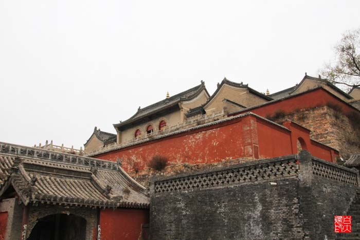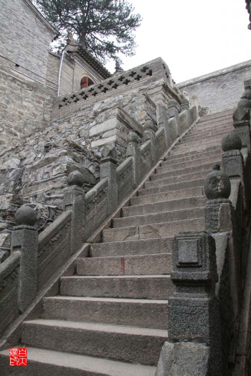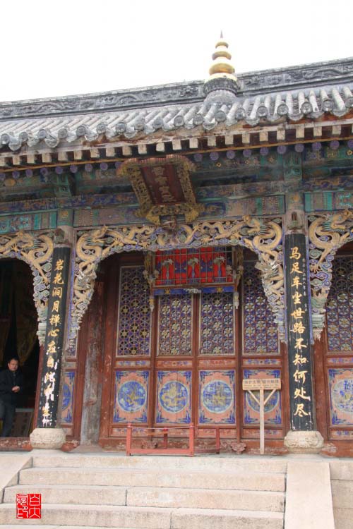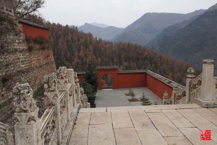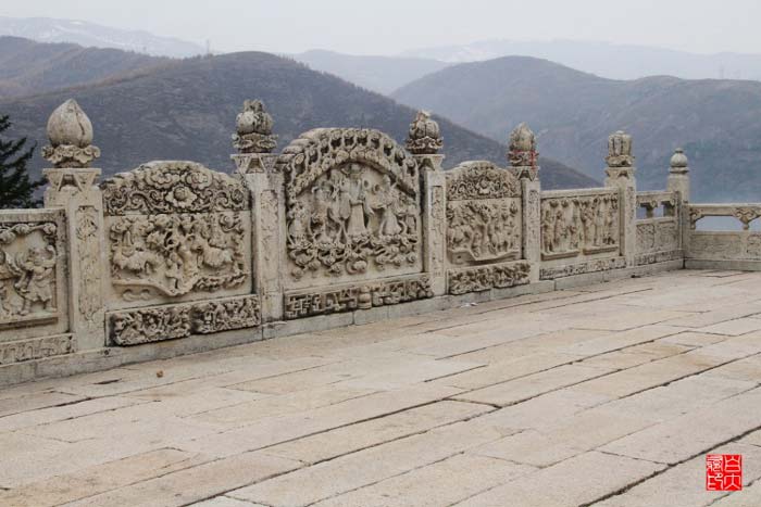 进寺前首先要登望峰台。站在望峰台上,凭栏远眺,松涛阵阵,夕照满目,远望中、西,南、北四台,如在眼前。平台围墙和石栏杆上,都刻满浮雕,共有琴棋书 画、桃李梅竹、喜鹊登梅,奔马逐日,飞龙走兽、仙鹤芙蓉、孔雀牡丹等316幅,桃李鲜露欲滴,梅枝横斜疏密,劲竹节节向上,奔马竖鬃扬尾,仙鹤亭亭玉立, 芙蓉暗香浮动,孔雀巧展羽屏,牡丹花开富贵,一只欲扑的猛虎虎视眈眈,全身用力,虎爪人地三分。幅幅作品都雕得极为逼真。平台围墙雕有八洞神仙,个性鲜 明,形象生动。他们是飞剑斩虎、点金济众的汉钟离;倒骑白驴、日行数万里的张果老;令牡丹冬开数色,并每朵有诗一联的韩湘子;蓬首垢面、坦腹跛足的铁拐 李;江淮斩蛟、岳阳弄鹤、客店醉酒的吕洞宾;散财济贫,人山修道的曹国舅;身穿破衫,一脚着靴、一脚跣露、手捋大拍板子、行乞闹市、乘醉而歌的蓝采和;行 动如飞、日往深山中采果奉母的何仙姑。