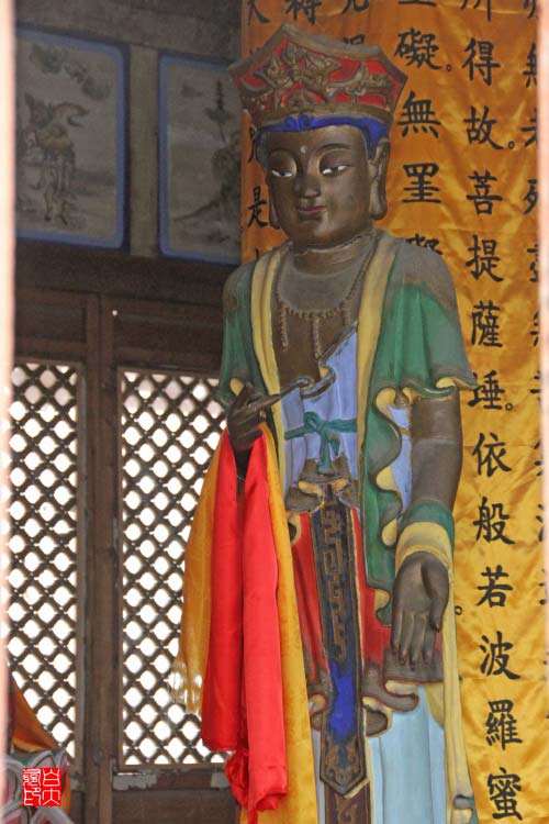 第一层殿内供一尊汉白玉石雕弥勒佛像。殿的左右山门和房屋上的石雕有317幅,附于殿壁、马头、迎风、 压面之上。内容有三国故事,天女散花、苏武牧羊,青龙播雨、凤凰展翅、鹿登梅山等。三国故事幅面较多,如关云长千里走单骑,猛张飞横槊当阳桥,还有空城 计,诸葛亮手摇鹅毛羽扇,逍遥自在地坐在城楼上,城楼下司马懿率众兵欲退又进,满腹狐疑,惟妙惟肖,形象生动。“天女散花”是浮雕中的优秀作品。在刚劲的 松树下面,天女体态袅娜,翩翩起舞,脸庞甜润,修眉妙目,云髻高挽,衣带飘逸,情深意浓,纤纤玉手拿着精美花篮,篮口吐出各种各样的鲜花,似花云花雨一 般。
