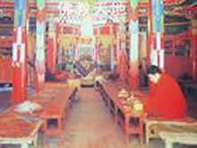 黄庙本身由黄庙、却热、居都外、曼巴等四个建筑物群组成,主体建筑为黄庙。寺庙群总建筑面积2.4万平方米,占地长2.5公里,宽600米。黄 庙正殿矗立一尊麦德尔佛,高2.7米以上,是当年从青海省塔尔寺运来的,故俗称“青海佛”。右侧是藏金洲,左侧为宗库,佛像今已不存,只残存佛座。庙内还 绘制有13幅宗教人物壁书,他们是布仁巴克西、贡布、共古热、共尕、茶汗阿吾、却杰、代金巴吾、推木那木钭、巴音邻木思热、加木思仁、哈木、道尔吉基格基 特、宗库等。书面虽已剥落,仍依稀可见其真迹。东距黄庙五百米,建有却金库热,大殿有16根雕花大柱,正中的四根雕有四条蛟龙,栩栩如生。据说这些座庙的 主神却金,保护弥勒佛有功,故立此庙纪念他。
