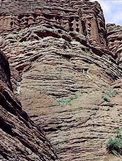 石窟座落于峡谷深处的悬崖上,窟口距地面30余米,山体系细砂岩质,经风化剥蚀呈现独特的景致。图片左侧依稀可见最初发现洞窟时供调查者攀登的软梯,洞窟右侧为新近搭建的栈道。