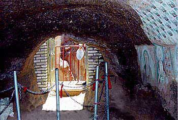 沿著牧羊人辟出的路走進克孜里亞大峽谷。峽谷兩側的山高約百餘米,谷內細流蜿蜒,蹊徑曲回,險狹處天開一線,僅容人仄身貼壁而行,山腹 開闊處,遍佈叢生的野草,猶如平沙庭院,阿艾石窟離地面約四十米,現今在山崖的一側由上至下懸垂一條軟梯,這是登上石窟唯一的途徑。或許最初開鑿石窟的人 也曾架設過索梯,從崖壁陳舊的磨痕可以看出這裏曾經有一架摩崖懸梯。洞窟不高,進洞時要躬身而入。