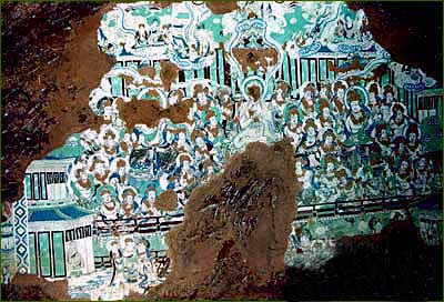 洞窟正面的壁畫上繪有西方三聖圖,居中為阿彌陀佛,左側是觀音菩薩,右邊為大勢至菩薩。這幅壁畫是依據《無量壽經》內容描繪出的西方極 樂世界景象:畫面的背景有亭臺樓閣,上方繪有祥雲朵朵,菩提雙樹和回環暢遊雲霧間的飛天像;下方闌台有寶池、玉橋,左為一組樂隊,畫面上有箜篌、琴、大 鼓、篳篥、阮、腰鼓、排簫、琵琶等,構成了一幅西天極樂世界。