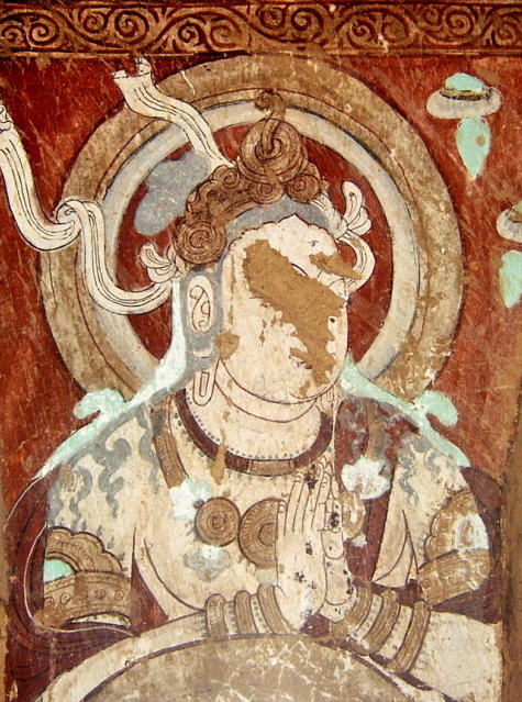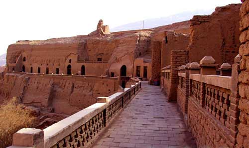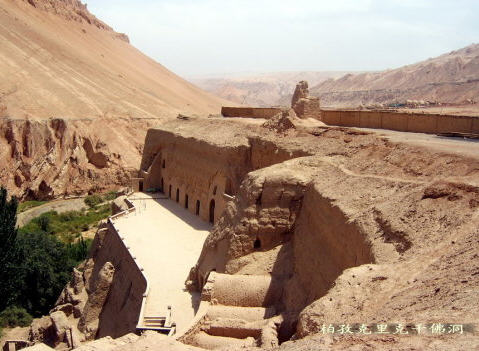 “柏孜克里克”的维吾尔语意是“山腰”,对千佛洞所处地理位置的指定恰如其分。一个个洞窟,蜿蜒开凿在扇面的岩壁上,洞窟外面的平台上没有遮 拦,可以临高远望。但在古代,平台上建筑着高大的殿堂、回廊、木拱门楼,如今已不存在,使我们无法看到佛教繁盛时寺院的宏伟景观,只留下些破败的遗迹和洞 窟中剥落残缺的壁画。