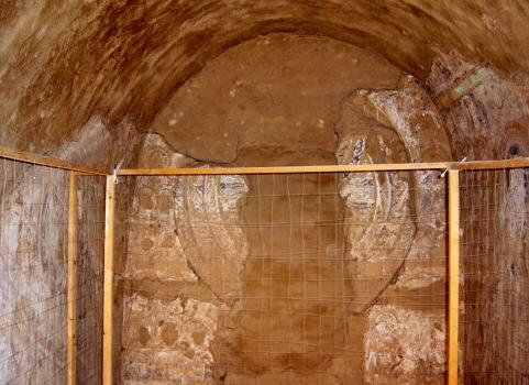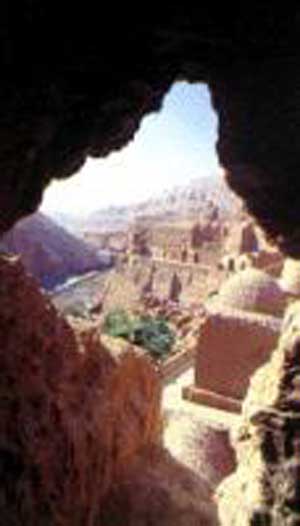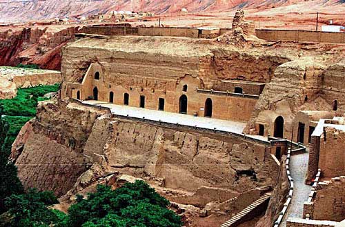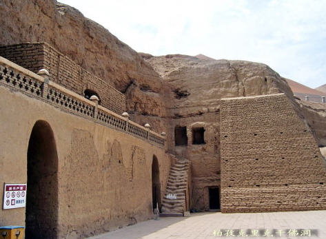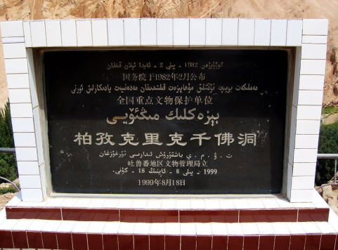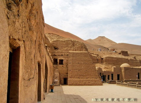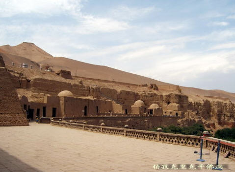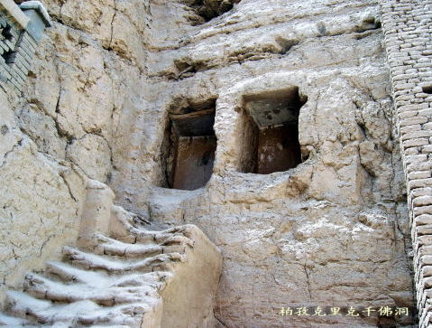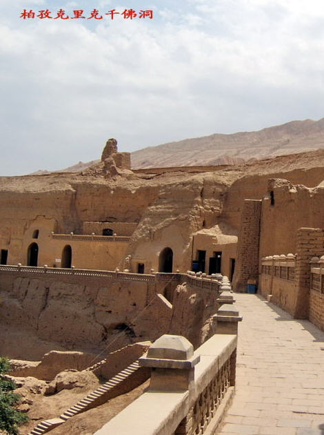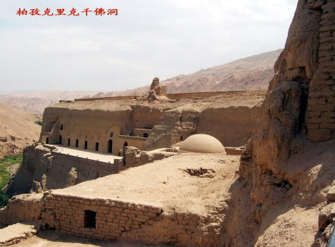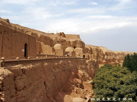 柏孜克里克千佛洞位于吐鲁番市以东略偏北的火焰山峡谷木头沟中,紧靠在火焰山最佳观景处旁的半山腰间。顺着山道往下走,只见一个个洞窟鳞次栉比 地排列在沟西的崖壁上。这里是吐鲁番地区现存洞窟最多的一个石窟群。被国务院列为全国重点文物单位的千佛洞壁画,可与甘肃敦煌的莫高窟相媲美。