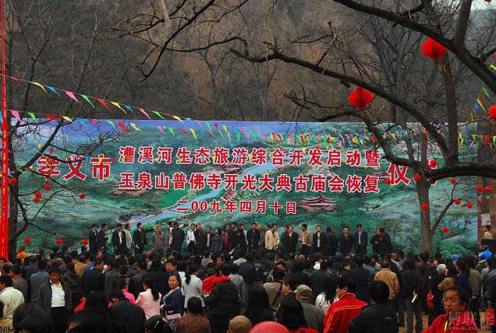 椐旧孝义县志记载玉泉山及普佛寺原为孝义八景之一,山清水美,风景优美,有一泉名为玉泉,值阳春三月,杏花怒 放,经过5年的艰苦修复,已初具规模,将于2009年4月10日农历3月15日举行佛像开光和景区剪彩仪式,届时将有大德佛教人士开光诵经和为期7天的消 灾延寿,祈祷国泰民安的佛事活动。玉泉山生态旅游区和普佛寺的建成将对孝义经济转型和环境保护将起推动作用。地址在东许乡河底村和宜兴村交界处玉泉山。到 时大家值得去看看啊。