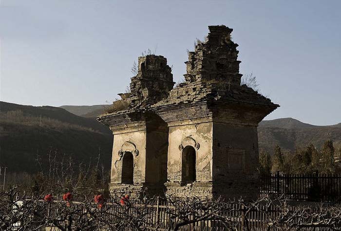 在开化寺上寺之南,即寺底村西500米的山坡上,有宋淳化元年(990)所建释迦、如来两座舍利塔,是开化寺的下寺遗址。二塔坐西朝东,形体大致相同, 均高12米,边长3米,间隔1米,下连基座,故称“连理双塔”。除蒙山大佛外,连理塔是开化寺惟一存留下来的古建筑,距今已逾千年。其塔由塔身、塔顶、塔 座3部分组成。塔基为砖砌长方形状,塔身正面开半圆形拱门,门框、门槛、门额都用青石做成,门楣之上有彩绘。右塔(金光佛舍利塔)塔身有石制直棂假窗,左 塔(化身佛舍利塔)塔身有石制半开假门。塔身上部迭次而成,挑出塔檐0.5米,高达1米,塔顶层层内收,呈八角形亭台式样,极顶置石雕宝珠。两座塔淳朴稳 健,形制独特,下层基座和塔身为唐代单层墓塔的一般制法,而塔顶则是宋代的手法,具有唐宋过渡时期的特征。连理双塔近观隽雅秀丽,远眺犹似两朵未开的花 蕾,在全国也是罕见的。连理双塔2004年6月被确定省级重点文物保护单位。