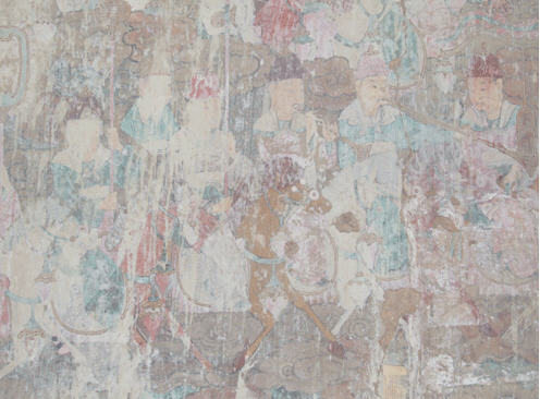从大王店现存大殿三面山墙上的壁画看,反映的就是赵武行云布雨的情景,壁画面积68.7米,绘有大小不同的神道及各类人物112 名,整个画面以赵武兴风作雨的场面为中心,其中电母手持镜子,雷公身背八面鼓,风伯口中“呼呼”使风,画面色彩相宜,浓淡有致,采用中国传统绘画的散点透 视画法,远观近视,线条洗练明朗,生动逼真,是我们了解明代民风民俗的一幅珍贵的画卷。