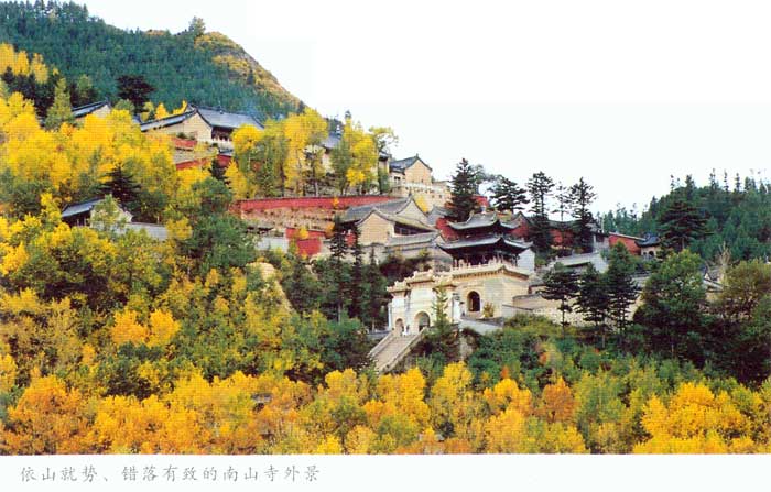 从台怀中心区沿公路南下至杨柏峪村,转向西过清水河,行数百米,就来到南山寺所坐落的山脚下了。南山寺依山而建,海拔 一千七百多米,面积九十多亩,计有殿堂楼房窑三百多间。南山寺整个寺院由七层三大部分组成,上三层名佑国寺,下三层名极乐寺,中间一层名善德堂,南山寺是 它们的总称。杜牧《阿房宫赋》中描绘阿房宫时说:“五步一楼,十步一阁。廊腰缦回,檐牙高啄,各抱地势,钩心斗角。”五台山南山寺,有着同样的气势和风 姿。步入寺内,回栏曲径、亭台楼阁,应接不暇,甬道深处、院落门首,多有石刻题词、对联,特别是各类建筑物上的石雕,题材多样,内容纷繁,游历其中,有步 移景换、多姿多彩的感觉。在寺庙中,象这样宏观浩大、微观精细的群体建筑是很少见的。
