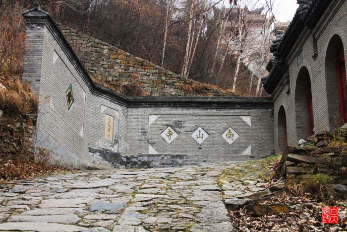 南山寺建筑依托山势,层次高低分明,错落有致。寺院最下面有一堵大影壁,长十七点三米,高约八米,石彻底座,砖砌壁身,顶部壁檐有砖雕,壁面嵌 有汉白玉石,上刻题词和对联。左边的石刻对联是:风化神中梦,迷路天作合。右边的石刻对联是:了道心圆地,真光上明天。中间圆形的石面上也刻有同样内容的 字迹。