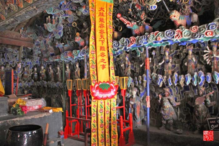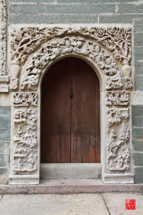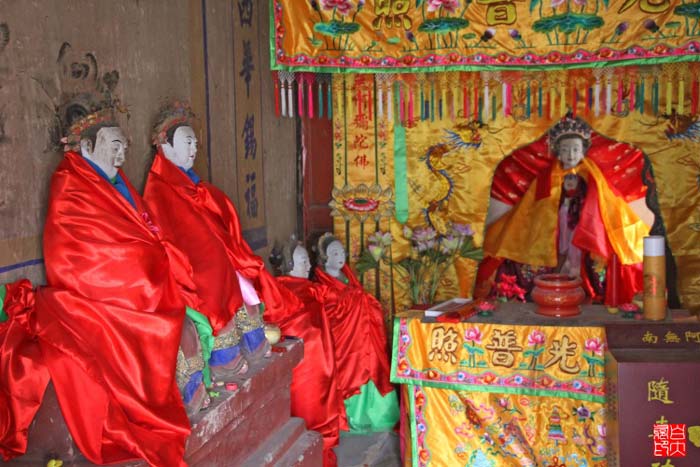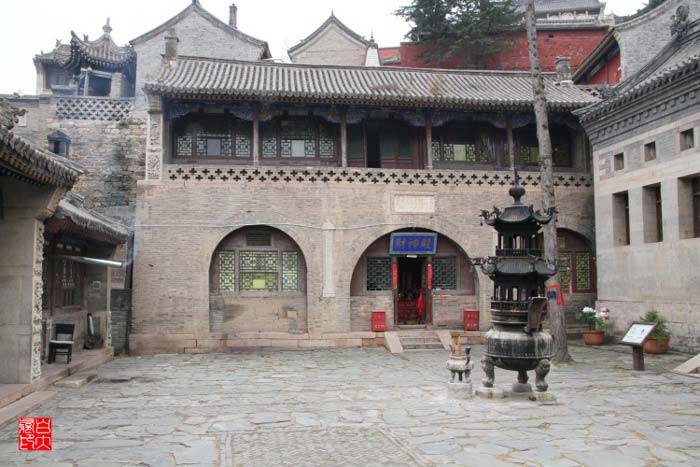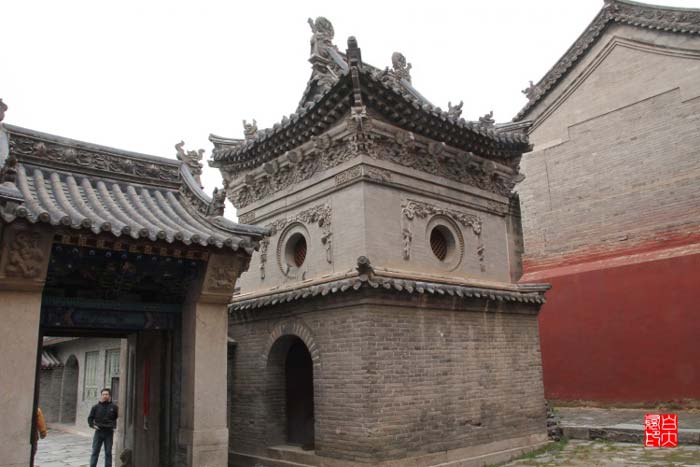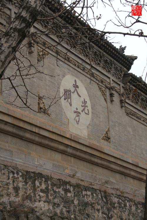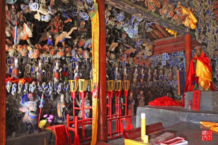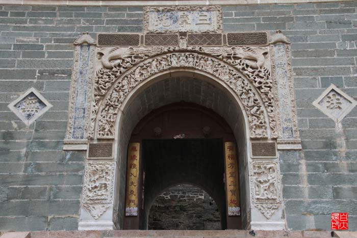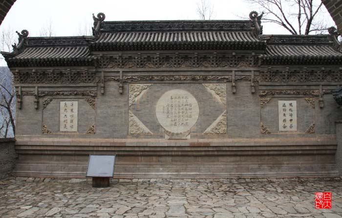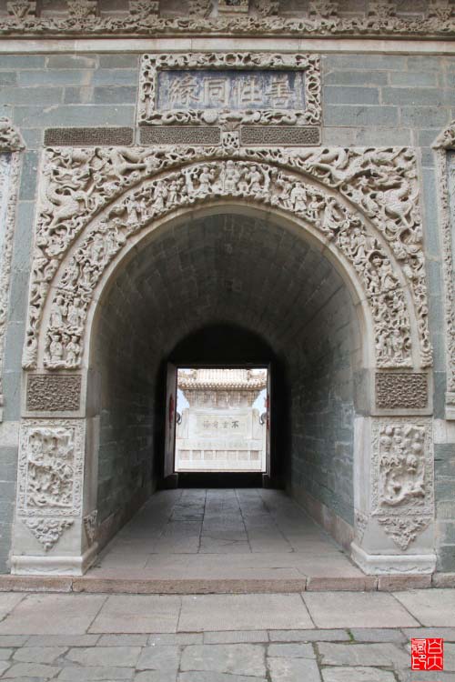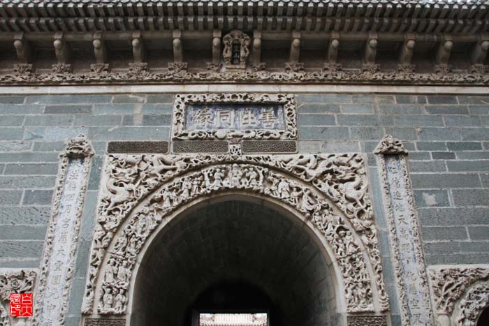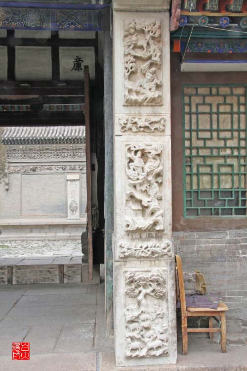 第三进院落开始,还是同一样式的高台建筑,台壁上,有块1米见方的”福禄寿三星“浮雕。福星居中,一手握腰带,一手握羽扇,老寿星在右,拄龙头 拐杖,眉须髯髯,额头隆起。他们的神态各异,福星矜持,寿星欣喜。这里高台建筑的石阶,上刻294幅浮雕 ,都是各种花卉和鸟兽。后高殿和两侧配房的石面上,有三国故事”三顾茅庐”还有根据《西游记》故事雕刻的“孙悟空、猪八戒登仙山”。坐南向北的配房石面 上,有一幅 “松下问童”的浮雕,画面为唐诗“松下问童子,言师采药去。中在此山中,云深不知处”的写意。