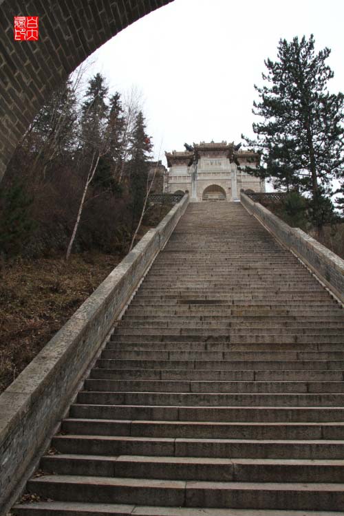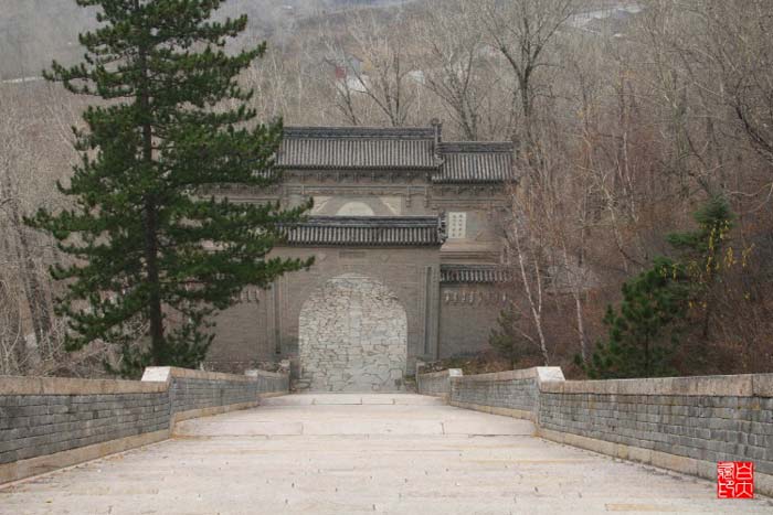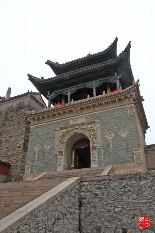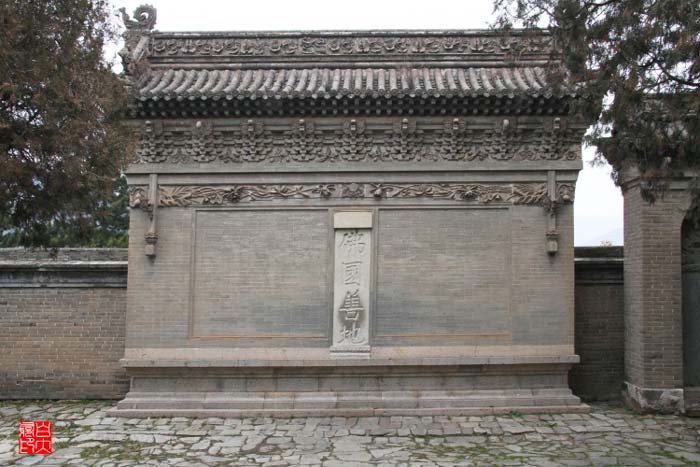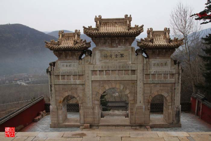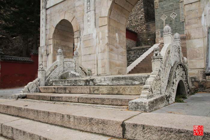 从影壁旁入寺院,首先登一百零八级石台阶。台阶宽大高长,雄伟壮观,在五台山首屈一指。台阶尽头的高台上,立有二座高大的石牌楼,长十二点八 米,宽一点六米,高约九米。牌楼下有三个门洞,上分三层楼头,一层比一层内缩,居中的楼头最高,两侧配以对称的分层次的四个楼头。中门洞额的石面上题有 “苍松无毁智转云中飞腾万里山水乎”字样。两个边门的外侧和内侧,都刻有楹联。牌楼的背面也有许多石刻题词和对联。