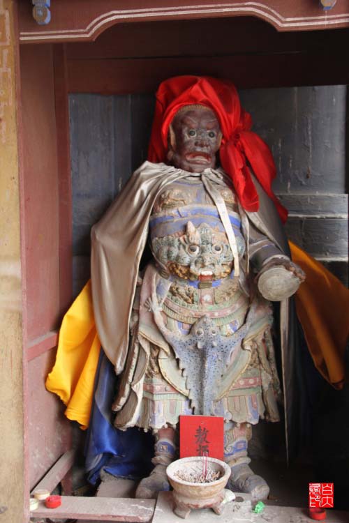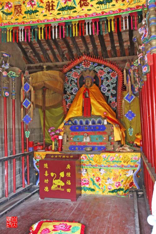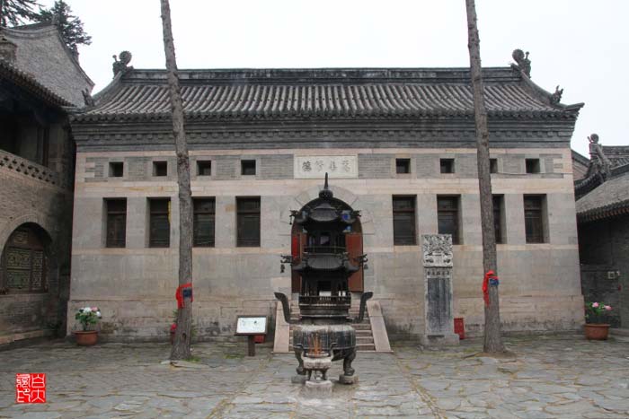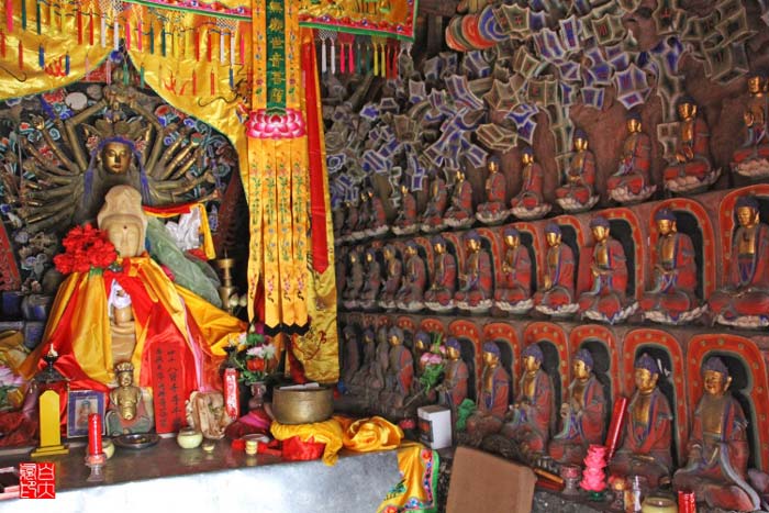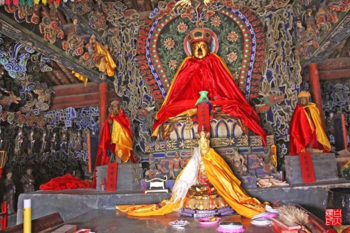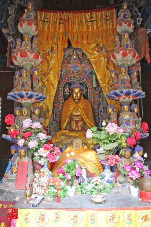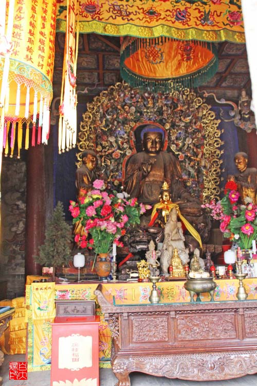 小径左侧。又有一个门,门旁有砖砌建筑的钟鼓二楼,入内是一个四合大院,大院正西经北向南的就是南山寺现存塑像设置最完整的大雄宝殿。殿内正中 为泥塑释迦牟尼佛和阿难、迦叶两个大弟子,再前正中为石雕文殊骑狮像。左侧为石雕送子观音像,观音菩萨慈爱地把小孩放在膝上,一手护抱,一手拉着孩子的小 手,观音菩萨的背后,卷起凹石,表示山洞的样子,这座雕像形象十分生动。右侧为木雕普贤菩萨。菩萨伸出的十八臂作出各种姿势,下踩一朵莲蓬,身边眼两头小 象,看上去翩翩欲飞。大殿两侧的泥塑十八罗汉,其工艺水平之高,在五台山所有大雄宝殿内同类塑像中首屈一指。罗汉的个性鲜明,有的疾恶如仇,有的泰然自 若,有的眉清目秀。有的老态龙钟,一个个栩栩如生。十八罗汉所靠的山墙内壁上有壁画,左侧壁画为释迦牟尼佛传记,右侧壁画为唐僧取经。