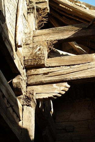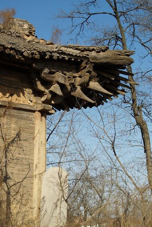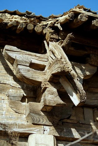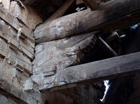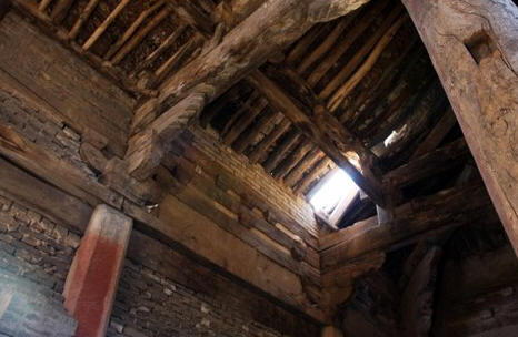 大殿已经空废,残破至极。前檐和后檐都塌陷过半。檐柱均用抹棱的小八角砂岩石柱,前檐 明间左侧的石柱上留有皇统元年的题刻。斗拱无补间铺作,柱头铺作大部腐朽脱落,转角铺作保存较为完整。柱头出双下昂,转角出单抄单下昂。斗拱真昂假昂并 用。有些奇怪的是前檐柱头斗拱都用假昂;而后檐柱头都用真昂,昂尾压在梁栿之下。走进殿内,瓦砾满地,因为屋盖不全,所以抬头就可望见碧蓝的天空。殿内梁 架看似四椽栿对前后乳栿用四柱,实则六椽栿对前乳栿用三柱。因为跨径过大,所以次间的六椽栿在中平槫的位置设内柱两根,柱头用圆栌斗,栌斗内以华拱和丁栿 相交。因为体量较大,所以和本地区当时流行的方三间小型殿宇的建筑手法相比,梁架结构显得颇有些新意。