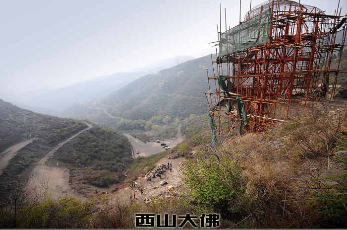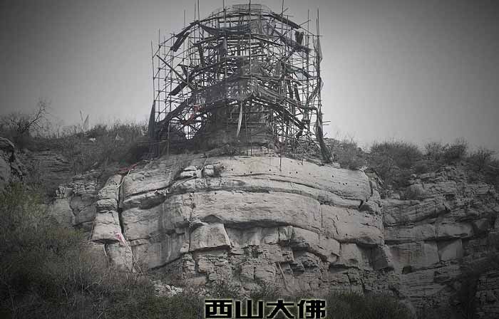 晋阳西山大佛所在的寺院,原为东魏所建的大庄严寺。北齐天保二年(551),高洋赐额“开化”,又称开化寺,并依山凿制佛像,建成上、下二寺,称“大庄 严石窟二寺”,可见“西山大佛”当初是称“石窟”的位于上寺之中。隋文帝仁寿初年(602),建起了庇盖大佛的大佛阁,改称“净明”寺。唐武德三年 (620),李渊留守晋阳,复名开化寺。显庆五年(660),唐高家李治和皇后武则天来幸并州,瞻仰开化寺和童子寺大佛,“礼敬瞻睹,嗟叹希奇,大舍珍宝 财物衣服”,并令并州州官长史窦轨“速庄严备饰圣容”,“开拓龛前地,务令宽广”。武则天和李治回到京城长安后,经两年时间,由皇帝内宫做了两件袈裟,派 专使驰马飞送并州,给这两寺大佛像赐披袈裟。袈裟上装饰的金银珠宝大放异彩,“放五色光,流照崖岩,洞烛山川”,“道俗瞻睹,数千万众”,轰动了并州。唐 武宗灭佛时,大阁虽然失修破败,但大佛未损。晚唐干宁二年(895),晋王李克用竭河东之力,“计口随钱,不可胜计”,五年用工三十万,重修了大佛阁。五 代后晋开运二年(945),北平王刘智远留守北京(晋阳),又修佛阁。这次重修的庄严阁,高五层,每层十三楹,二十六间,共一百三十间,将二百尺高的大佛 庇盖于内,可见阁之大。元末(1368),寺毁阁倾,火佛头部掉落,残砖破瓦和山间泥石掩覆了佛像下部。明洪武十八年(1385),晋恭王朱棡只重修了前 寺院,称法华寺。显赫了八百年的“西山大佛”便从此埋没六百余年。