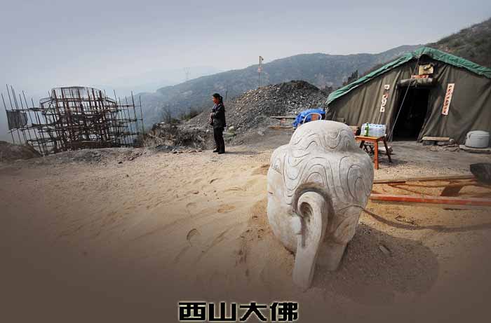 天龙山大佛在古城营村西南三十余里,中间有龙山阻隔,光照不到古城营村,可见“天龙山造像”并 非“西山大佛”。至于龙山童于寺大佛,碑刻方志都载有这尊大佛凿于北齐天保七年(556),其事在高纬凿成大佛之前,说明这也不是“西山大佛”,那就只有 蒙山开化寺大佛了。蒙山开化寺在“文革’中已毁,现寺发现残存断碑中有五代刘智远《重修蒙山开化庄严阁记》碑,碑载“西山大佛”就在这里。并且记载:像在 “寺后一里”。后寺已不存在,地称“大肚崖”。近观石岩如大肚,遥望,胸、臂分明,无头,原是一座山岩凿成。一个石刻巨人胸颈兀突现于群山之间,爬上巨人 颈上东南眺望,山豁间可见二十里外古城营村,晋阳宫遗址处就在眼前,确是可以“燃油万盆,光照宫内”的,这一石刻巨人,就是“晋阳西山大佛”。