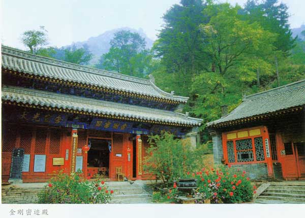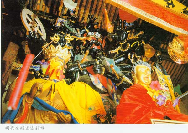金刚密迹殿内供有黑色木雕的“九头十八臂金刚菩萨”一尊,塑像黑脸黑身,伟岸高大,左脚立地,右腿屈起,脚踩风火轮,成“金鸡独立”之势。面部威严,身 躯肌肉隆起,健壮有力,极富神采,是五台山惟一的密迹金刚像。明月池对面山上有一座金刚宝塔,砖建,四角,密檐,类似鞭节,高12.4米。