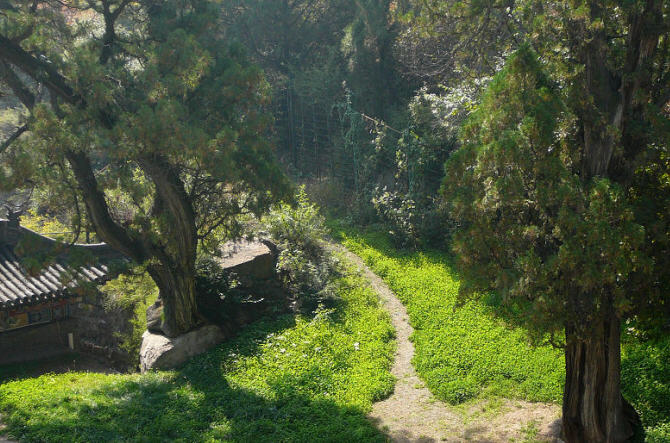 太山龙泉寺位于太原市晋阳古城遗址西2公里的风峪沟太山之上,山脚下有五代后唐名将李存孝的墓葬。“太山”之名始见于《宋书》,相传五代时刘知 远招兵买马,有太山勇士石敢当袖20公斤的大铁锥应征,人莫能敌,闻名于晋阳。这里的山势突兀峥嵘,古柏苍翠欲滴,将龙泉寺裹藏在中间。