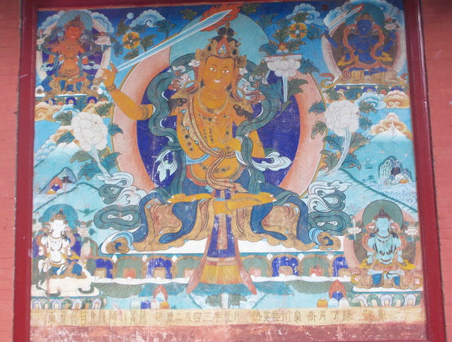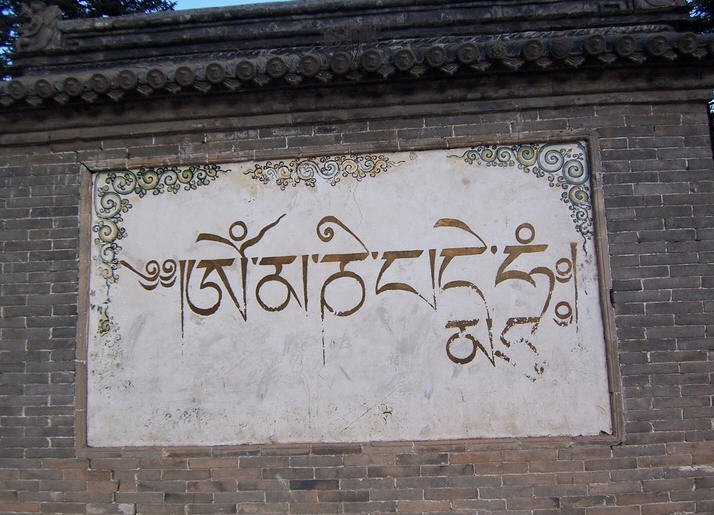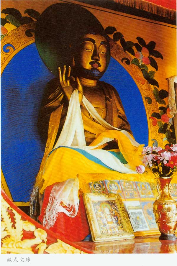 盘示寂。这八幅浮雕图案从塔身南面始,从右侧绕塔一周。在这八相图浮雕中,释迦牟尼及弟子、摩耶夫人、侍女、 卫士、牧牛女、魔军和各种动物,形象生动,雕刻精细,具有中国化的风格,为清代石雕艺术精品。在须弥座束腰转角处,雕刻着四尊托塔金刚力土,袒胸露腹,呈 半蹲式,有的一手撑腰,一手高举,有的双手高举,一起承托着塔台。他们胳膊上和脸上的肌肉高凸,显出一种朴实、威武的气势,且具有蒙藏风格。须弥上枋,还 雕刻着祥云和花卉图案。塔身底部还雕刻着金刚圈、念珠和一层仰莲。塔身正面中间,雕有一个佛龛,龛中以高浮雕手法雕刻着三尊佛像,均为结跏跌坐姿势,中间 一尊佛像的左手为禅定印,右手为触地印,当为释迦牟尼。左边佛像双手作禅定印,可能是金刚藏佛。右边佛像左手在胸前托着一个宝瓶,右手作触地印,可能是宝 光佛。在佛龛周围还刻着著蒙藏式菩萨装的八大菩萨:文殊、观音、弥勒、金刚手、虚空藏、除障盖、普贤和地藏菩萨。塔刹下部为亚字形刹座,上面是十三级相 轮,上安由覆莲和宝莲组成的铜制鎏金塔刹。相轮两侧镶有铜制鎏金垂带,上铸祥云图案。