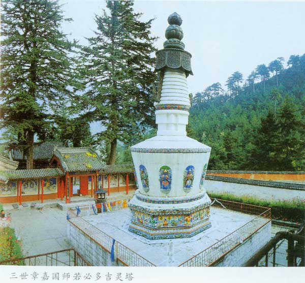 三世章嘉灵塔,结构严谨和谐,气魄庄严高洁,雕刻精美生动,是一融汉、蒙、藏和印度风格为一体的汉白玉的覆钵式灵塔,具有很高的艺术价值和观赏价值。