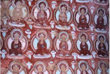 窟形多模仿龟兹的长方洞及方形洞。尤其后者,其主室为中央雕刻巨大方柱、左右两侧以回廊连接,且于方柱内部凿洞的复杂形式,在诸窟中最常出现, 而且盛行于九、十世纪。窟内壁画多半描绘授记的誓愿图。在六面壁上共绘成十五幅画,每一幅构图有极其严格的规划;中央是具有光轮的佛立像,下方则画上菩 萨、供养者,佛的周围下方安置菩萨、天部、神王,尊像与尊像间,则饰以五彩花纹。可惜这些壁画线条太硬、太趋于形式化;而且往往有两座洞窟的壁画采用同一 主题与同一布局。如第四与第九、第七与第十七、第十一与第四十,以及第十九与第二十窟中的作品。