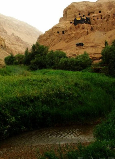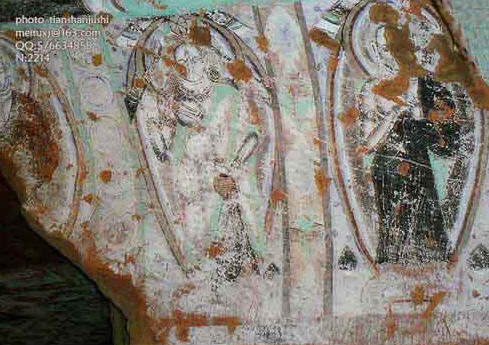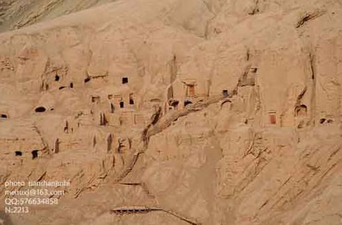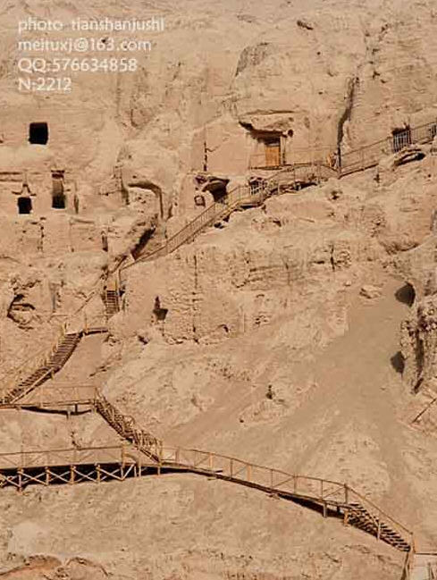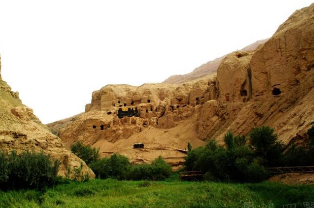 中国佛教石窟。位于新疆鄯善县高昌故城东约15公里处,为高昌最早的石窟。它凿建于火焰山东段吐峪沟两岸,现存编号 共46窟,其中仅有9个窟留有壁画。其窟形可分为方型窟、中心柱窟和纵券顶窟。方形窟以其窟顶形式,又可分为平顶式、覆斗式、穹庐式。石窟类型有支提窟、 毗诃罗窟和讲经窟 3种。以禅窟和讲经窟数量最多,计37个窟,且分居于礼拜窟左右,与克孜尔石窟布局相似,反映了中国早期石窟特征。吐峪沟石窟的壁画大部剥落严重,较能辨 其内容的第44窟中,正壁和两侧壁上均绘一佛二菩萨。本生故事画较为清晰,计每壁各有1组7幅画,每幅画旁有汉文题记。尚可辨认的壁画内容有:“羼提婆利 忍辱截割手足”、“摩钳太子求法赴火”、“慈力王施血饮五夜叉”、“萨□那太子舍身饲虎”和“毗楞竭梨王身钉千钉”、“尸毗王割肉贸鸽”等。据《西州图 经》记载,吐峪沟石窟在唐代西州时称“丁谷寺”。从现在石窟建筑和壁画风格分析,吐峪沟石窟约开凿于公元4世纪初,即晋设高昌郡之前。多数洞窟及壁画,应 凿绘于南北朝至隋代,即吐鲁番地区的高昌王国时期。