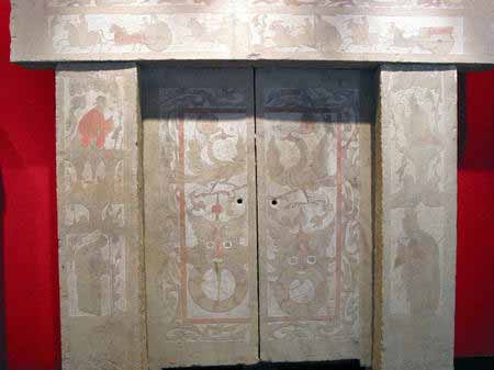 在神话传说的题材里,常见的有口衔圭的赤鸟、三足鸟、双头鸟,有鸡首人身、牛首人身、独角神马,有虎车、雁车、狐车、豹车、鱼车、狗车、龙车、车马出行 图,有东王公、西王母、羽人乘龙、羽人双龙等。为求得墓主人在阴间平安无事,画像石墓中常刻有铺首衔环、朱雀、青龙、玄武、白虎等吉祥动物。铺首衔环多刻 在墓门上,是门户的标志,铺首应为饕餮的演变,刻在墓门上是为了驱邪避鬼。青龙、白虎、朱雀、玄武是方位神,其职责是御四方,避不祥。除反映神话传说、神 话故事的内容外,还有部分反映贵族生活的题材,在这类题材中刻有重楼高阁,楼内主人宴饮闲谈,下棋听乐,有的奴仆捧食进撰,有的拱手作迎送宾客状。