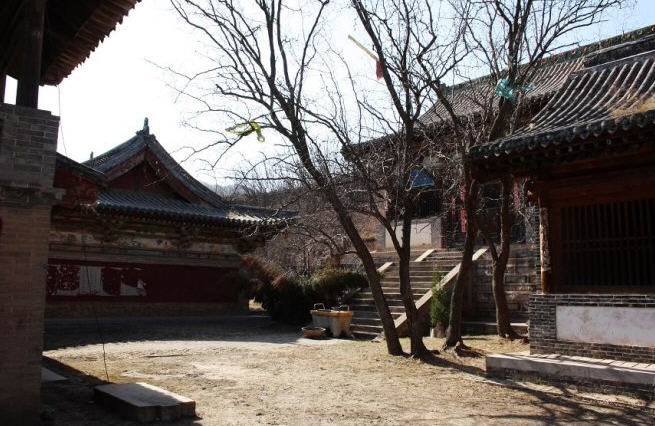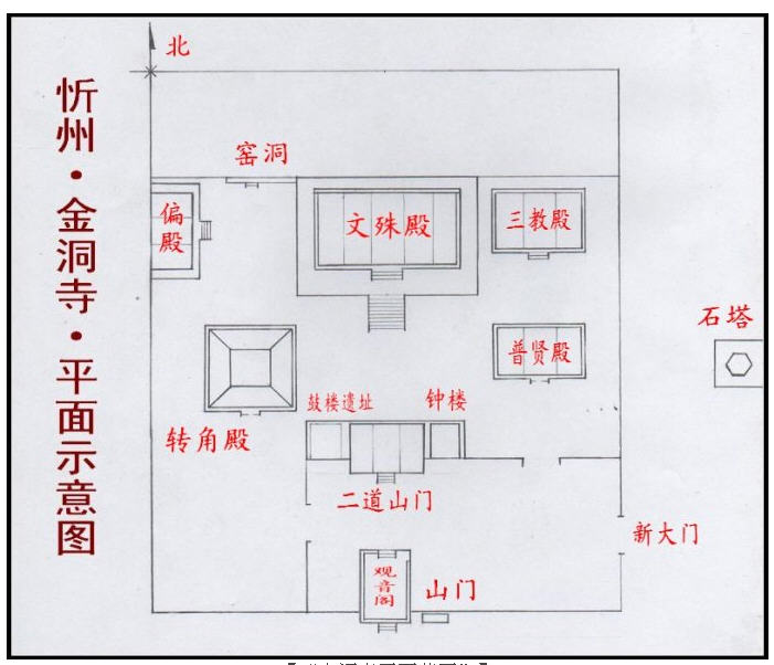金洞寺建筑别致,都是三间一处的正殿,不成规则的五个殿宇,依地形一个院比一个院高,形成五个独特的院落。