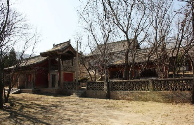 现存建筑有楼阁式的山门、奶奶庙、老爷庙、钟楼、普贤殿、文殊殿、三教殿和转角殿。其中,转角殿为北宋元祐八年(1093)所建。面宽3间,进深3间, 单檐歇山顶。殿身檐柱较矮,明间装板门,次间为窗,窗框甚小,屋顶举折平缓,正面外观近似敦煌莫高窟的北宋窟檐。檐头斗拱古朴,殿内依金柱制成神龛,梁架 全部露明,砍削规整,俨然宋代遗构。殿内有精雕细刻的木龛一间,其柱子,额枋、斗拱、梁架和瓦顶,配制协调,比例适中,犹如精致的殿阁模型,内供神农、伏 羲。正殿为文殊殿,面阔,进深各3间,悬山顶式建筑,为明代嘉靖七年(1528)所建。三教殿,也为悬山顶式建筑,面阔进深各3间,明代嘉靖二十年 (1541)重建,原供老子、释迦牟尼和孔子,是三教合流的标志。普贤殿,面阔进深各3间,也是悬山顶式建筑,系清康熙二十七年(1688)所建。而山 门、奶奶庙、老爷庙和钟楼,均系清代所建。