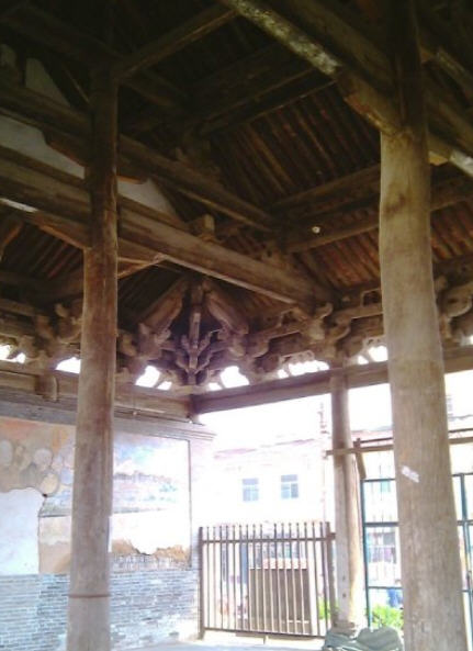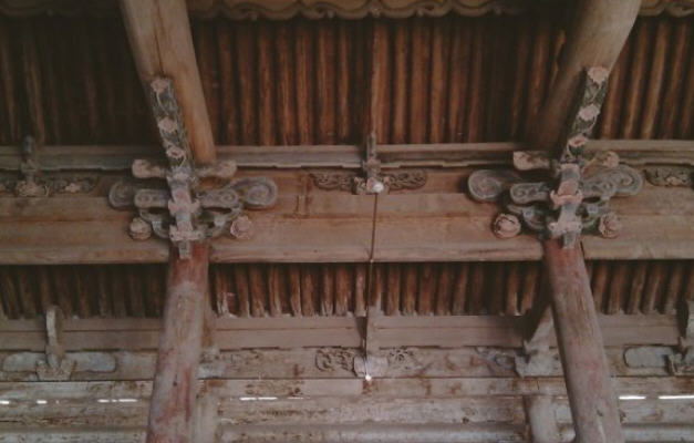 献殿面阔三间,进深三间,单檐歇山顶。梁架彻上露明造,六架椽屋分心用三柱。柱头斗栱五铺作双下昂,昂为琴面昂,补间各施一朵,形制同柱头铺作。昂为真昂,昂尾挑于中平槫下,阑额、普拍枋断面呈丁字形,用材规整。